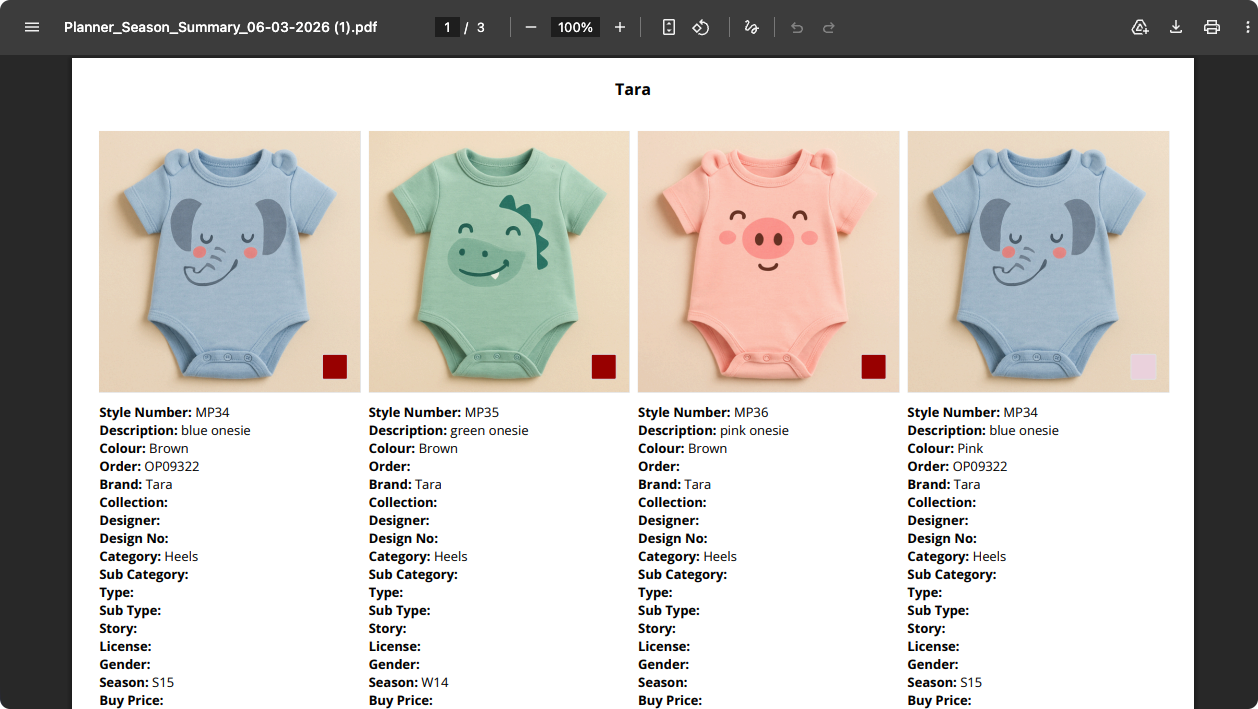 - Style images – Defaults to the Style Preview Image; uses colourway images from Style > Colours when available, or the Style Preview Image with a small colour tile when a colour swatch is configured