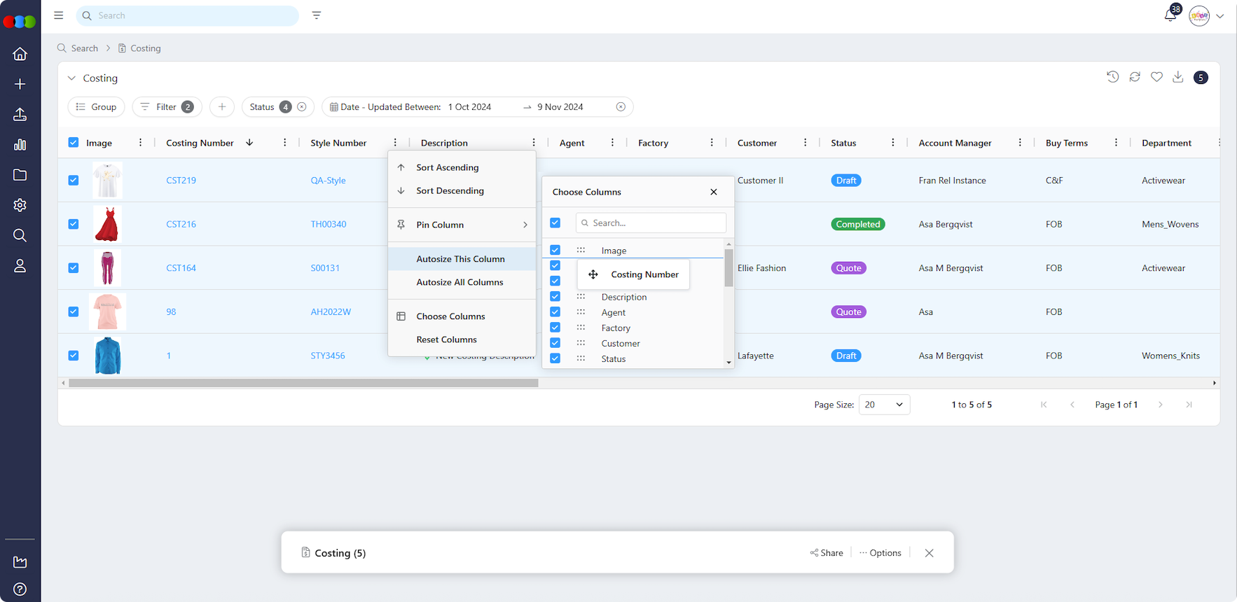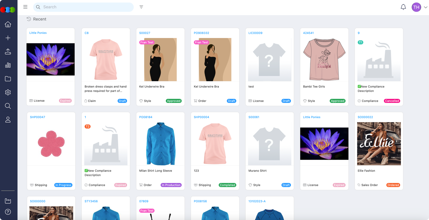 - Quick Links: Click on a specific application to see relevant Styles, Orders, Costings, etc.