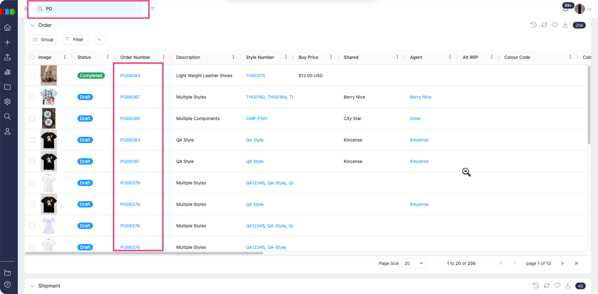 - Shipping: by Shipment number