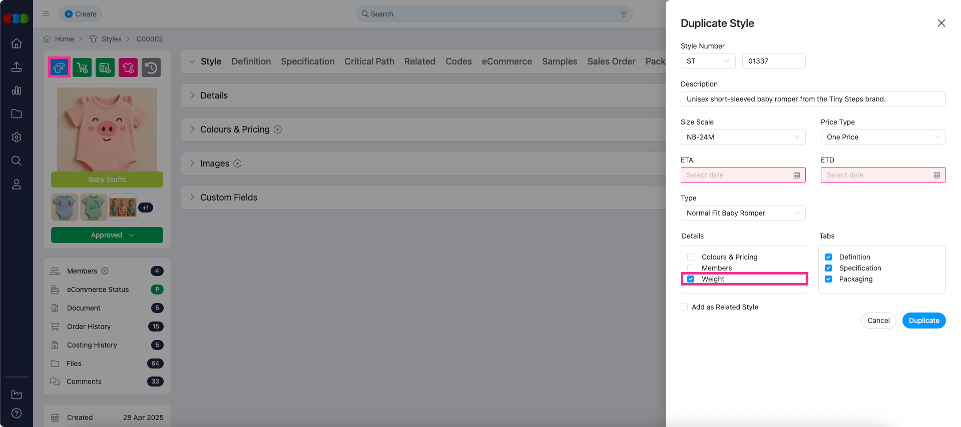 Now, you can simply tick the checkbox to carry over the weight from the original style to the new one.