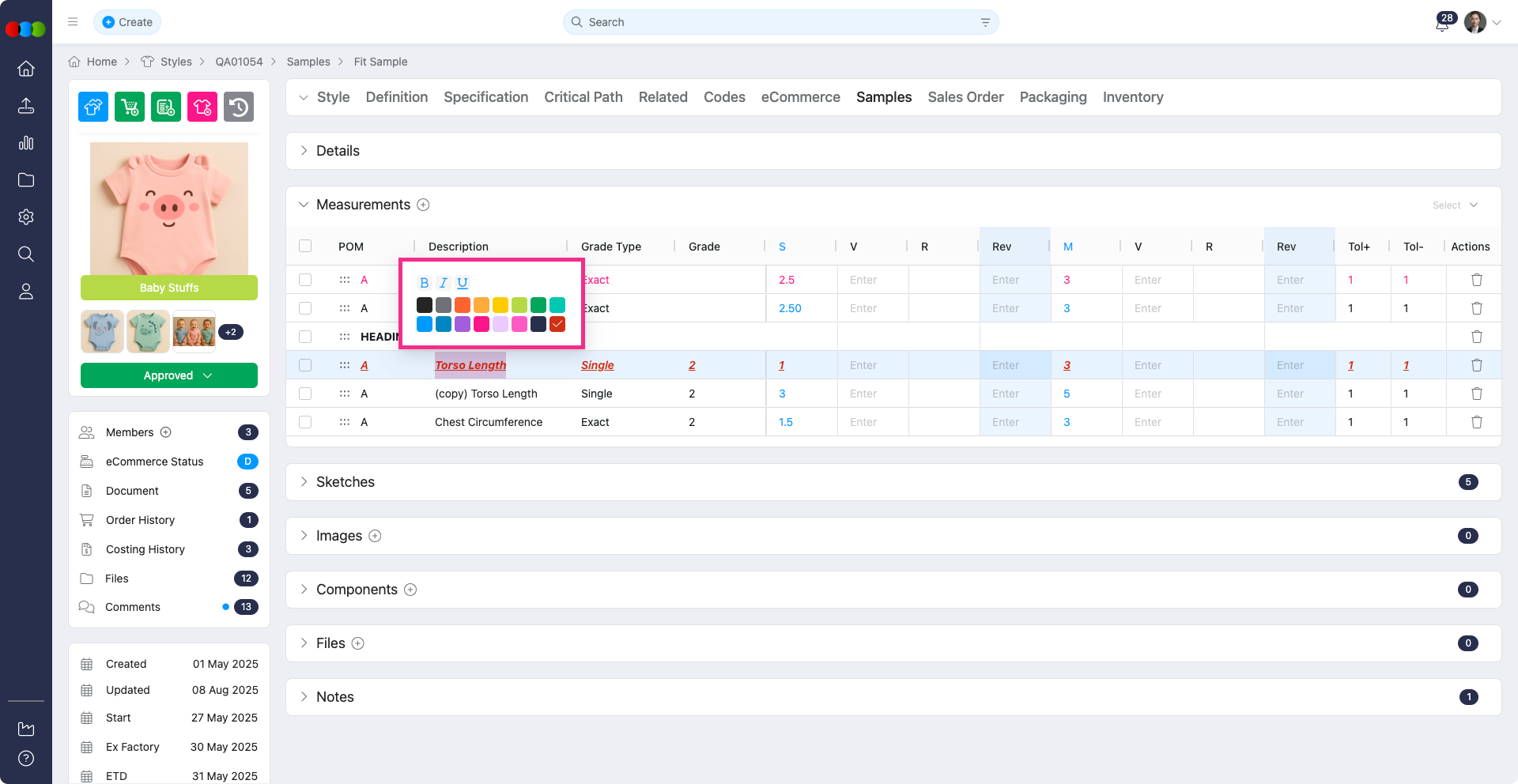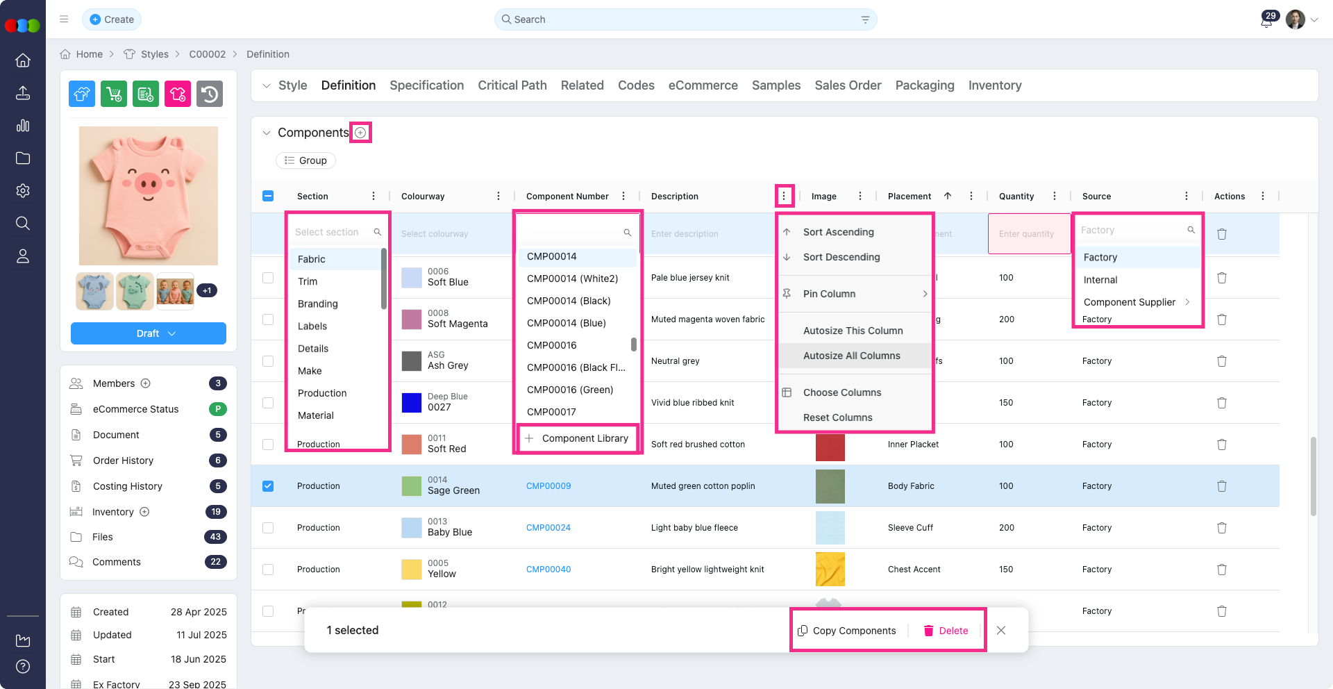 - Manage key details like images, colourways, placements, tags, quantities, and component sources directly in the list.