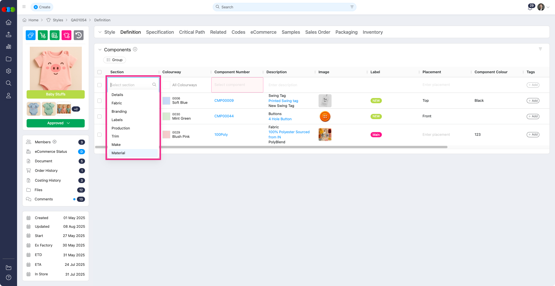 All components (Fabric, Trim, Branding, Labels, etc.) are now presented in a dynamic list view in Components section. You can now: