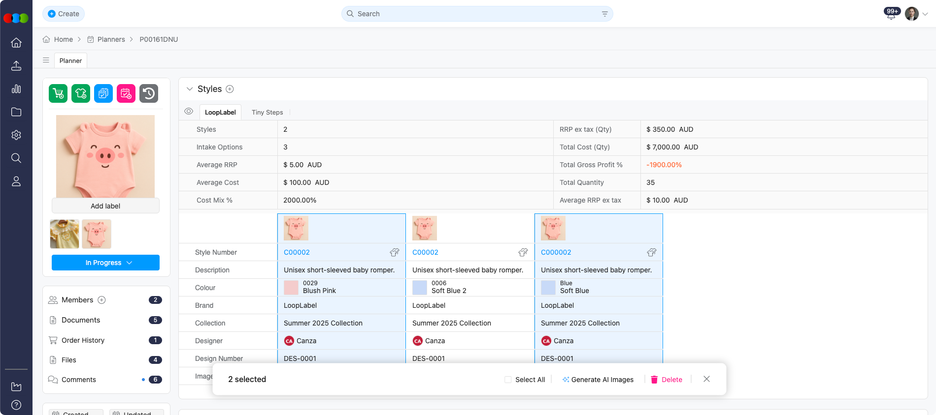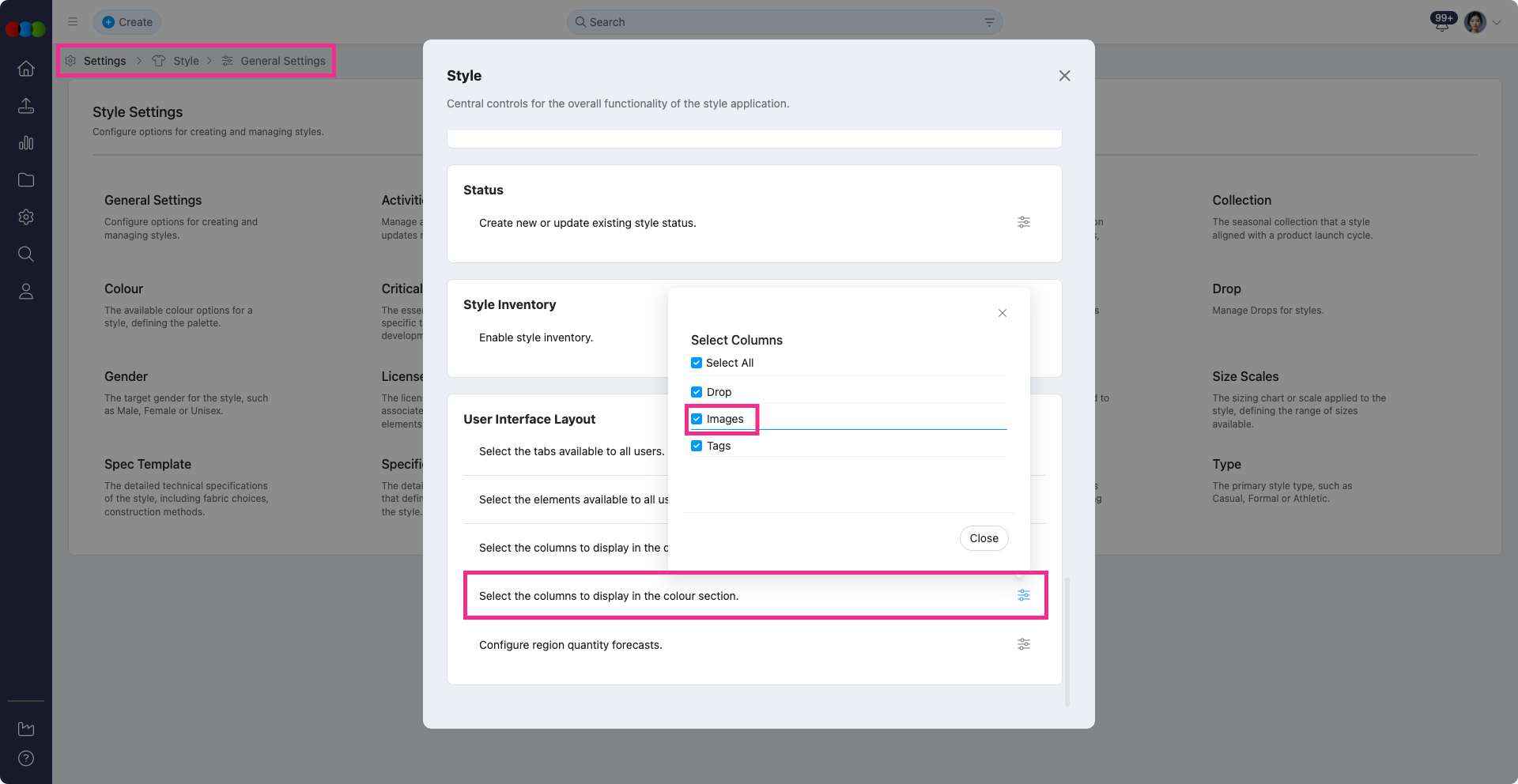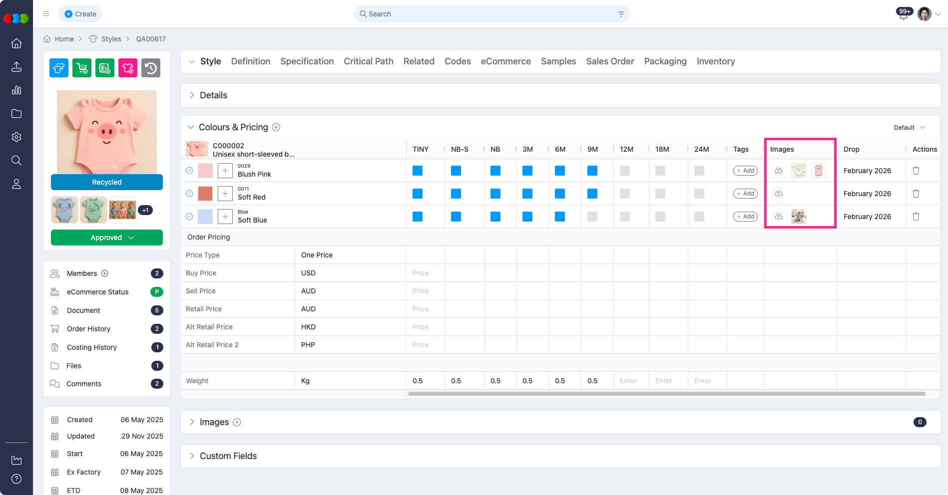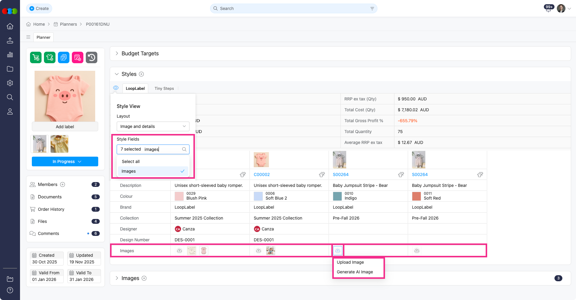 You can now optionally show or hide the images column. This column enables you to attach and view images directly alongside each colourway. Changes made in this column will also appear in Planner > Styles > Images row.
