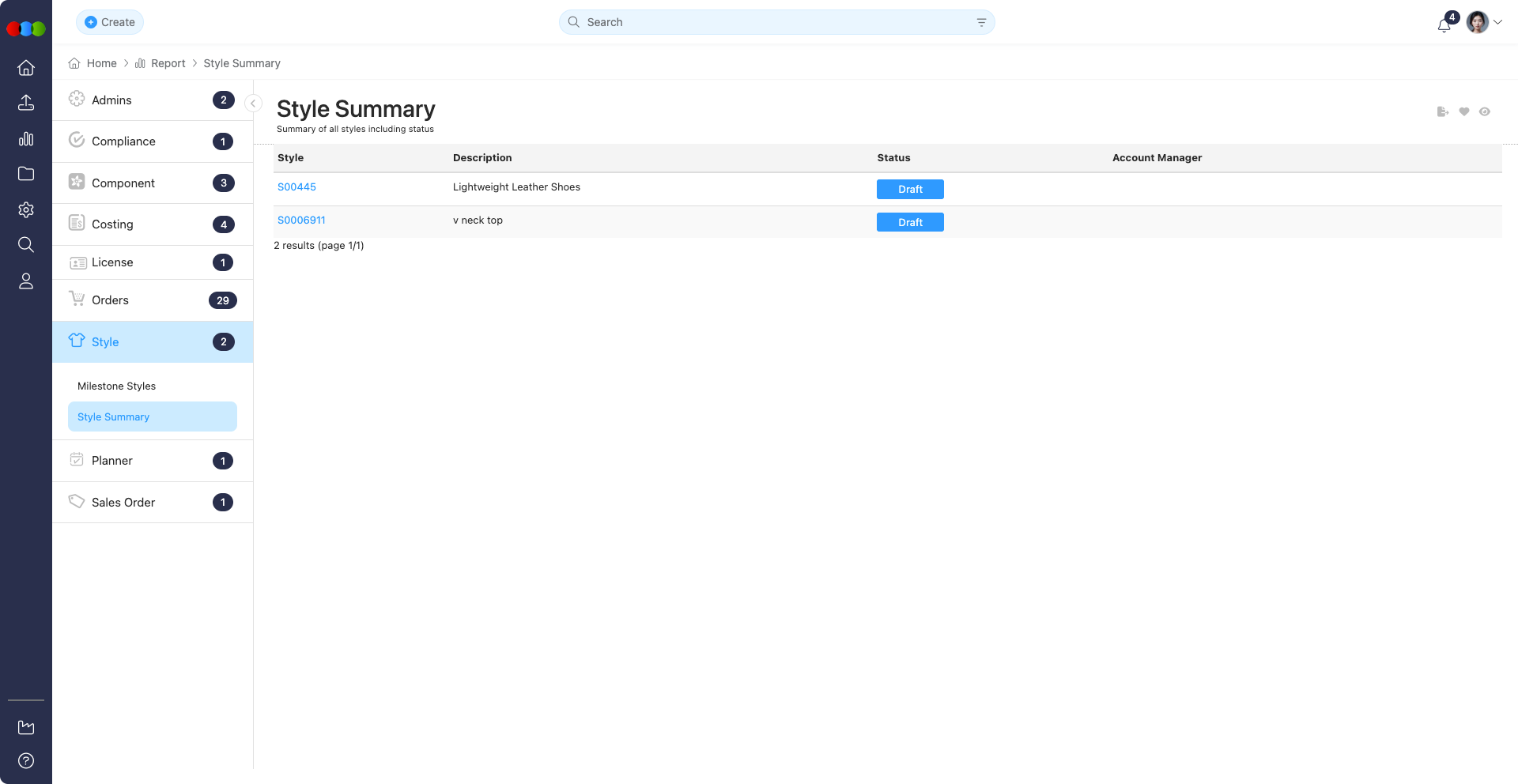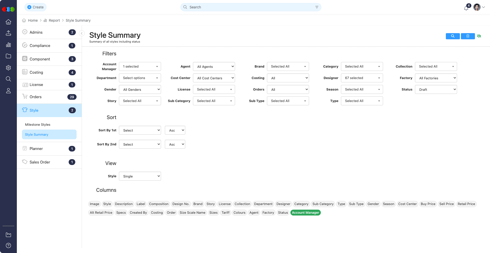 - We have introduced a new Account Manager filter and column to the Style Summary Report, featuring a multi-select dropdown of enabled staff members.