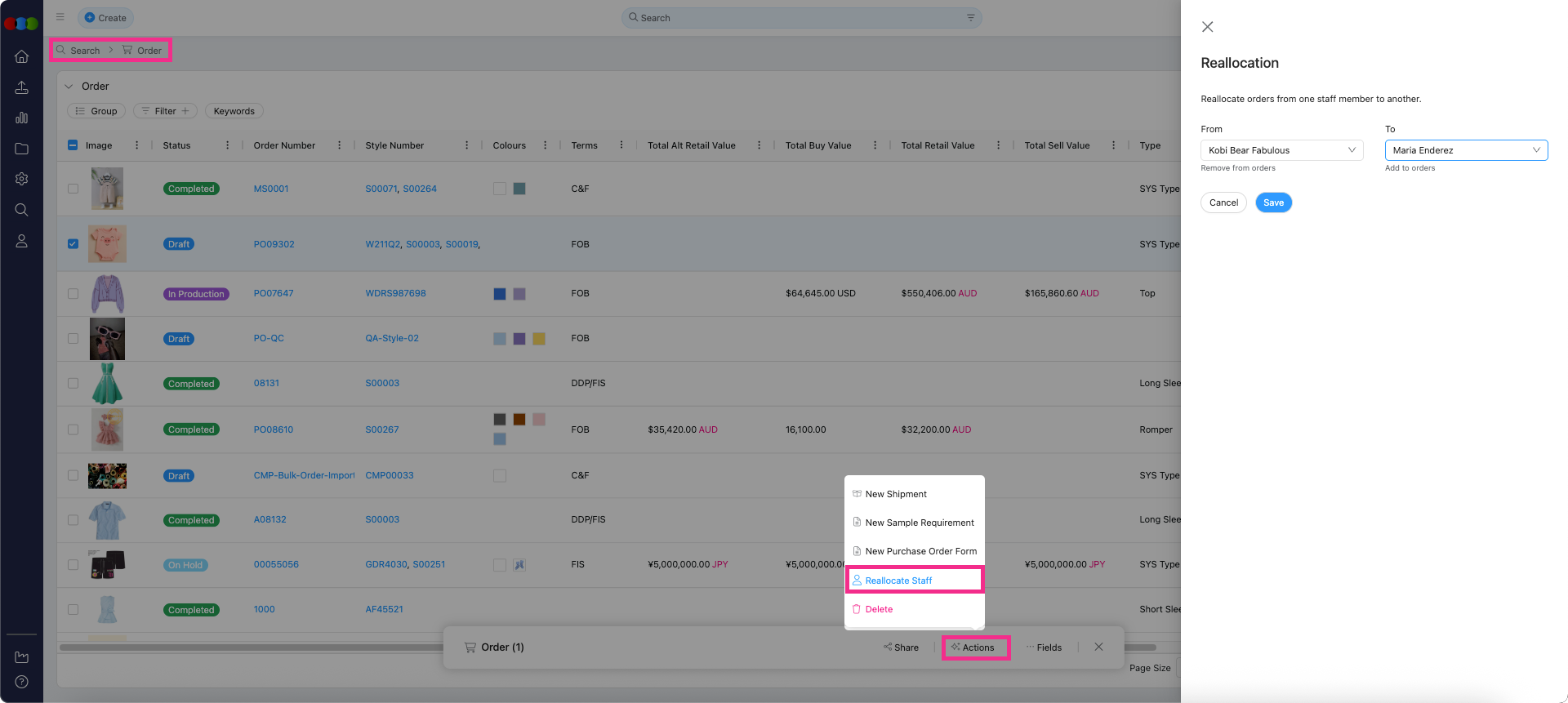 Search > Order > Bulk Actions > Reallocate Staff