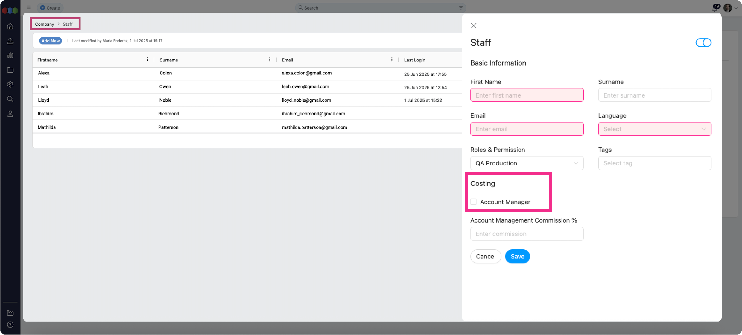 Previously, the Account Manager checkbox was missing from the Costing section in the Company > Staff pop-up.