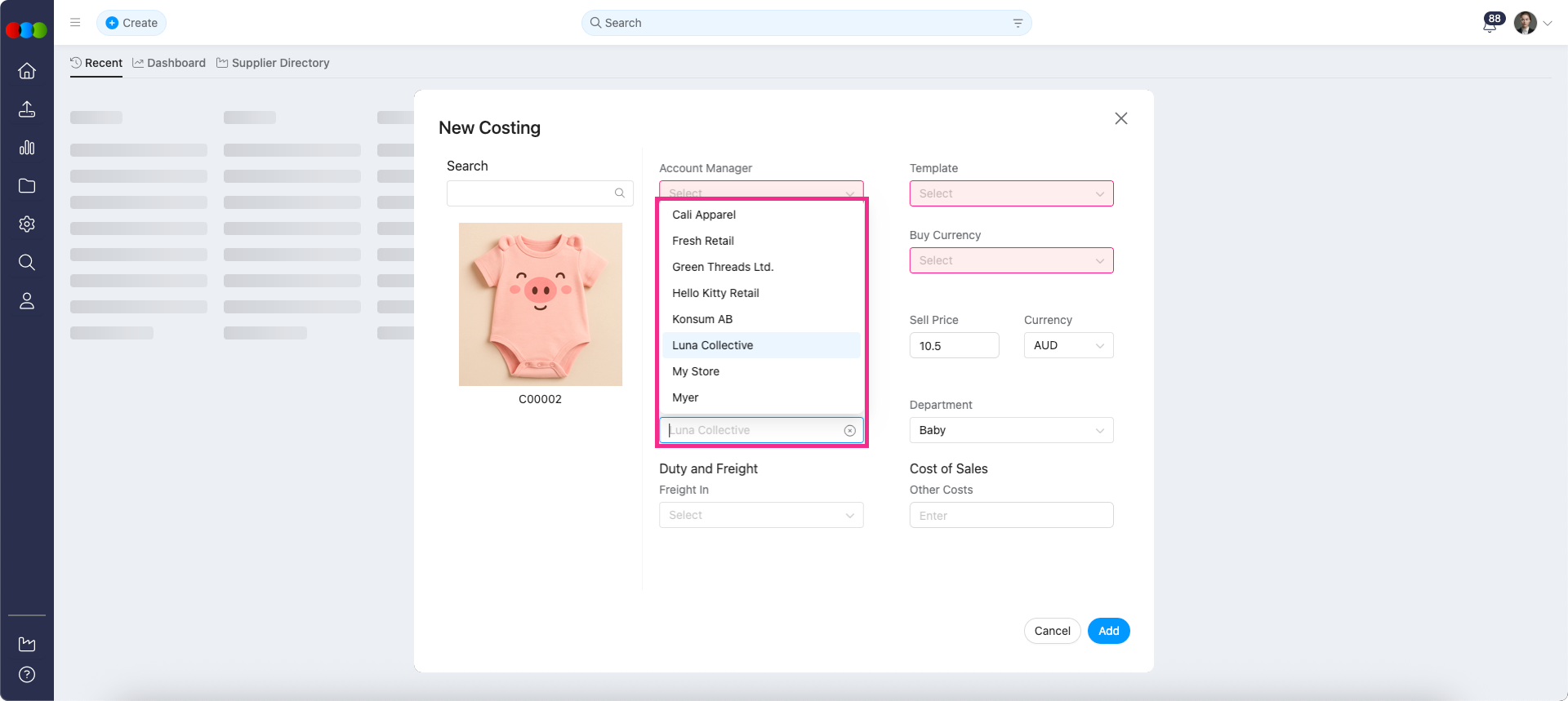 Create New > Costing > Customer Dropdown