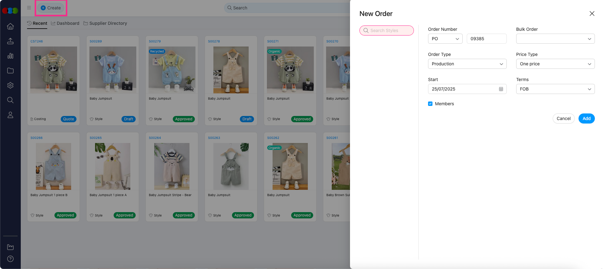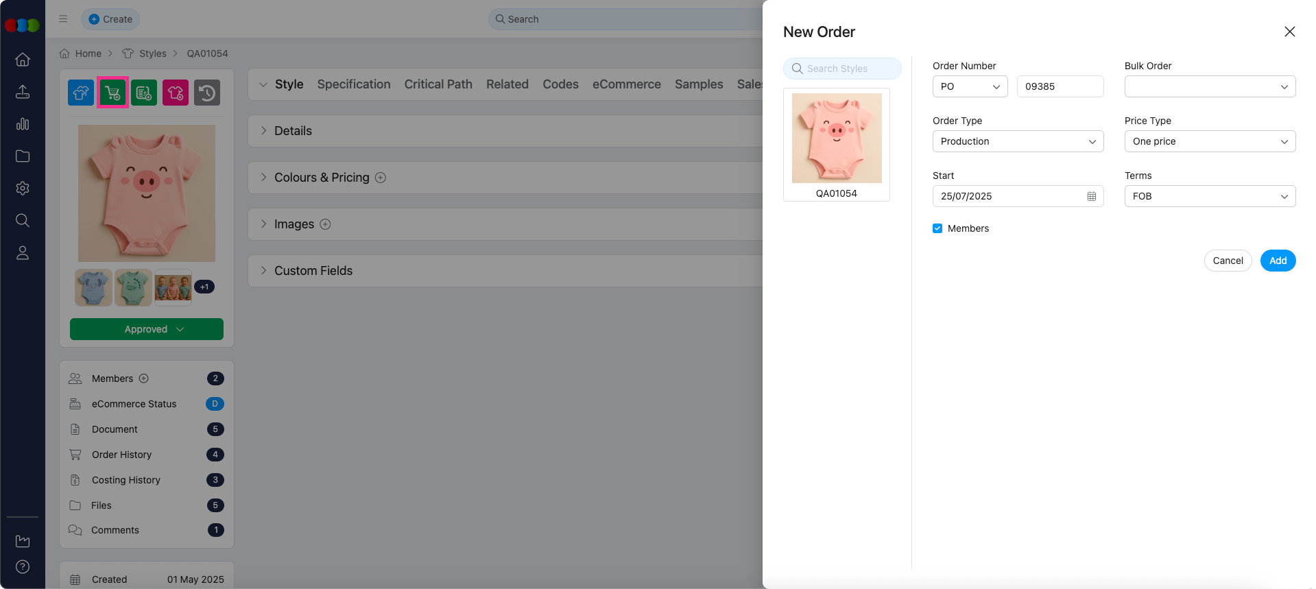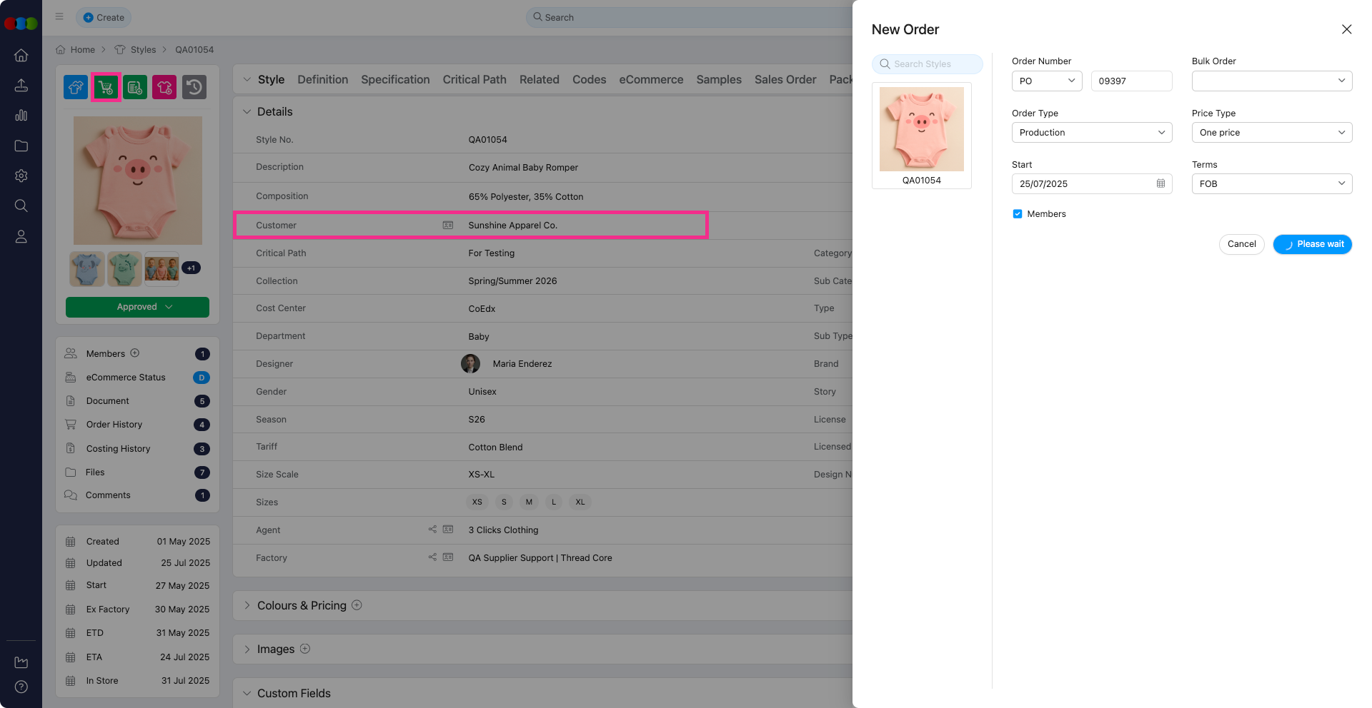 We've fixed an issue where the Customer was not being copied correctly from a Style to a new Order. Previously, the Customer field would not populate in the new order pop-up, regardless of whether it was set as a mandatory field in Site Settings.