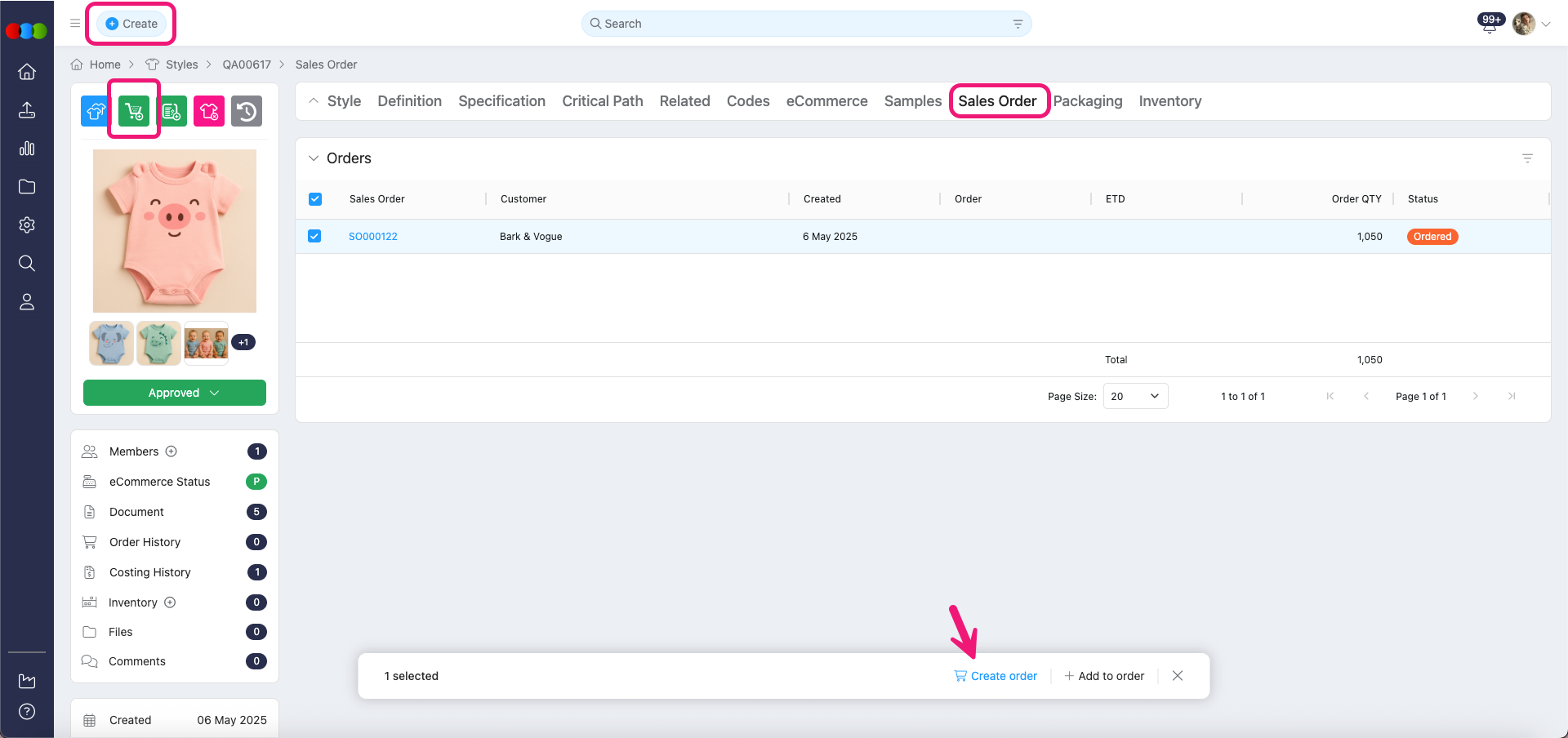 - Style > Sales Order Tab > Create Order