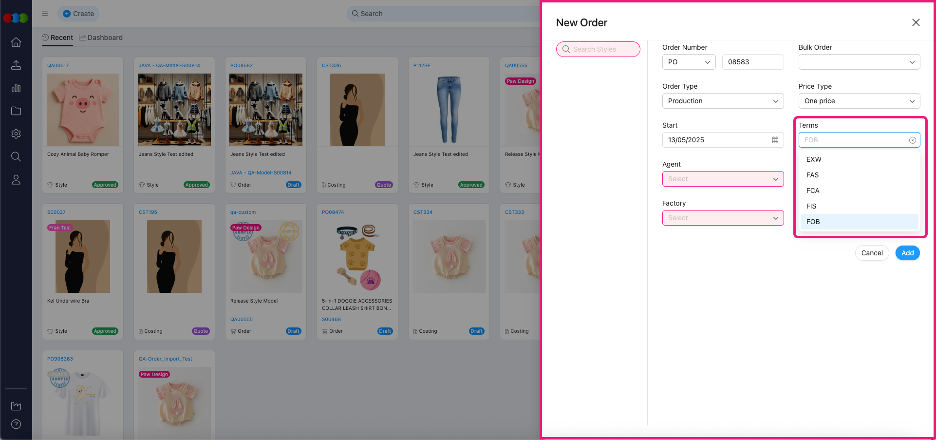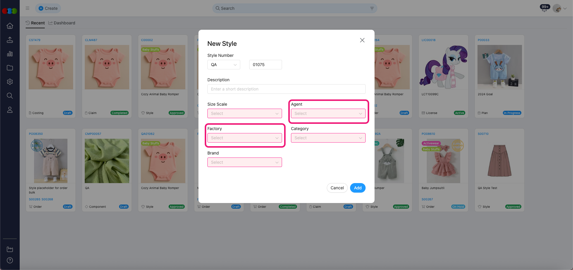 - Previously, in the Create New Style pop-up, the Factory field incorrectly appeared before the Agent field.