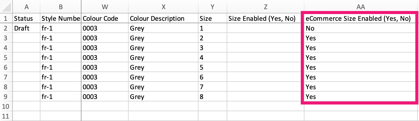 Style > Import > eCommerce Size Enabled (Yes, No)