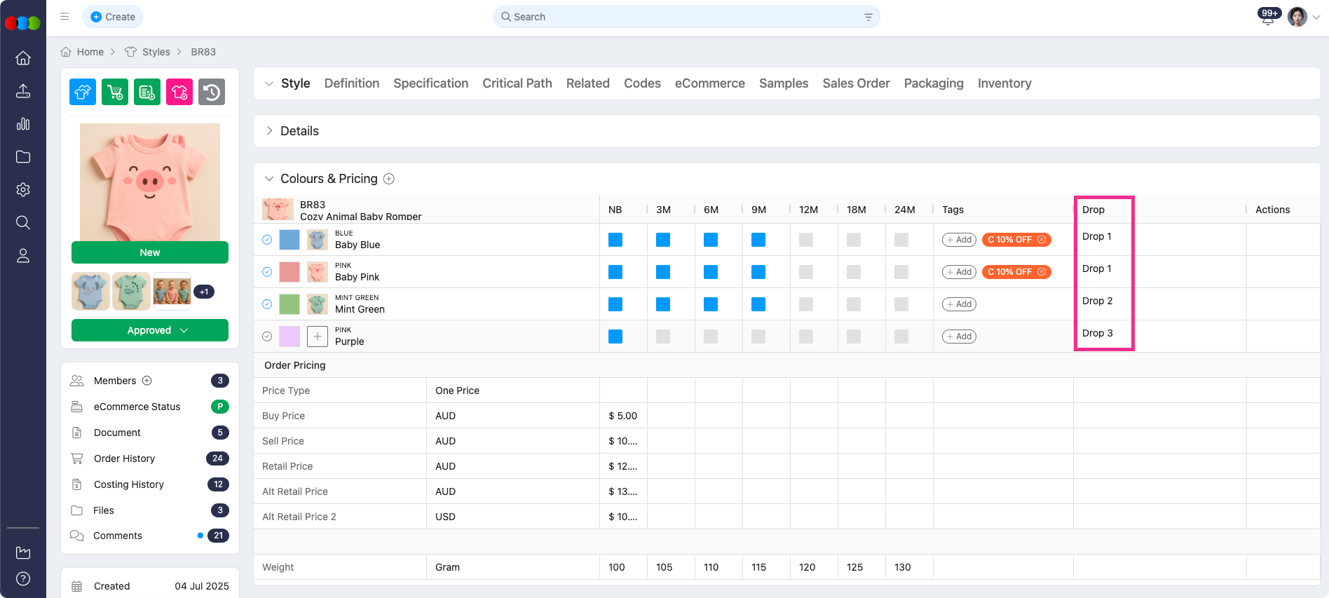 Style > Colours & Pricing > Drop