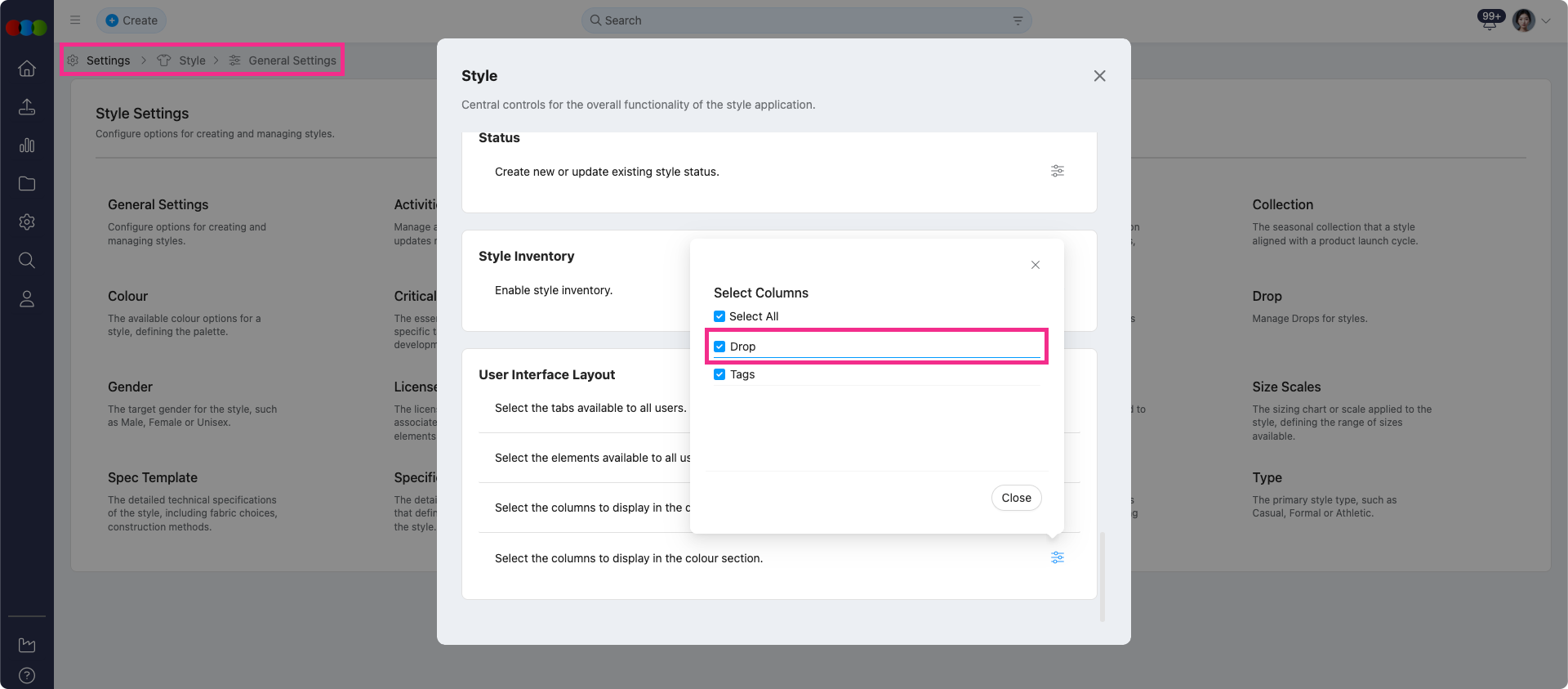 To configure whether this appears in your Style > Colours & Pricing section, go to Style > General Settings > User Interface Layout > Columns to Display.