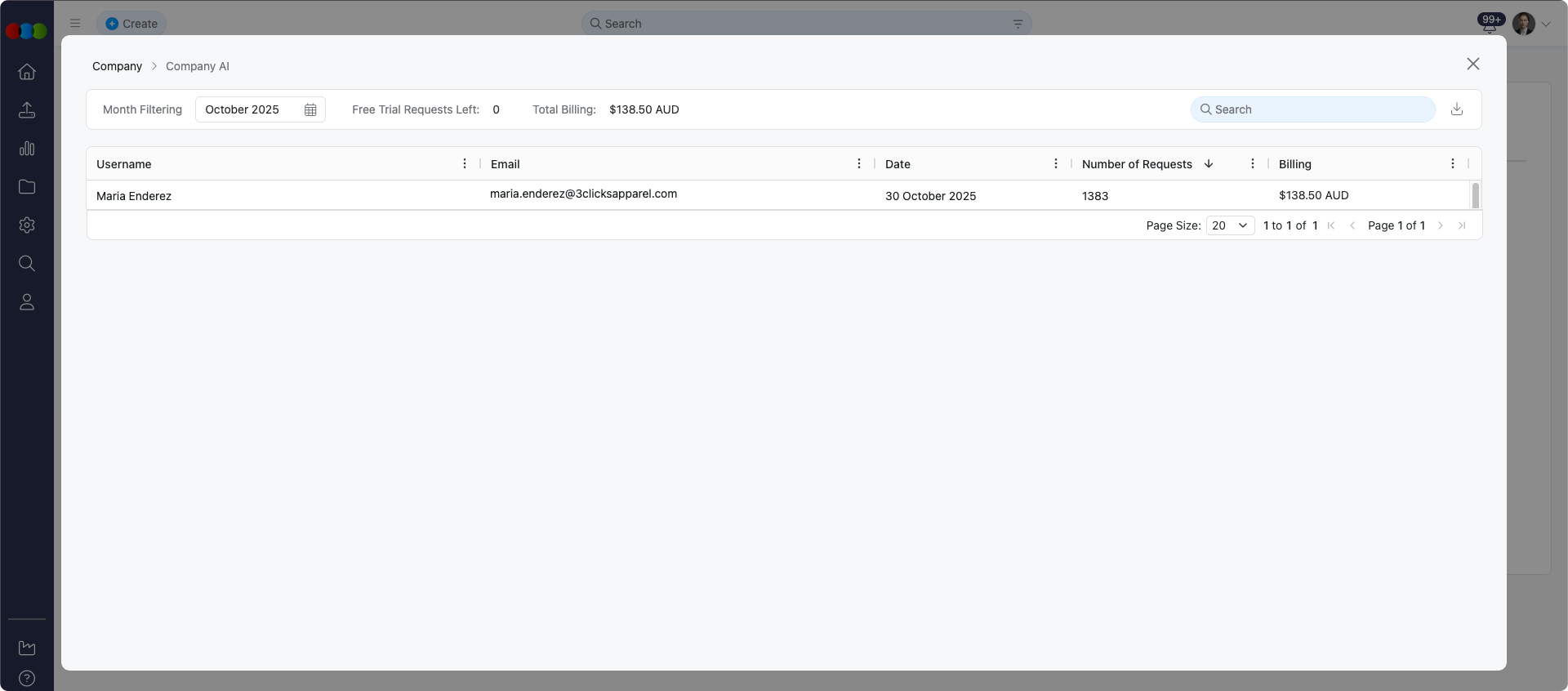 To monitor usage and set limits, navigate to Site Settings > Company > Company AI. This is where you can view trial requests, user activity, and export data to Excel.