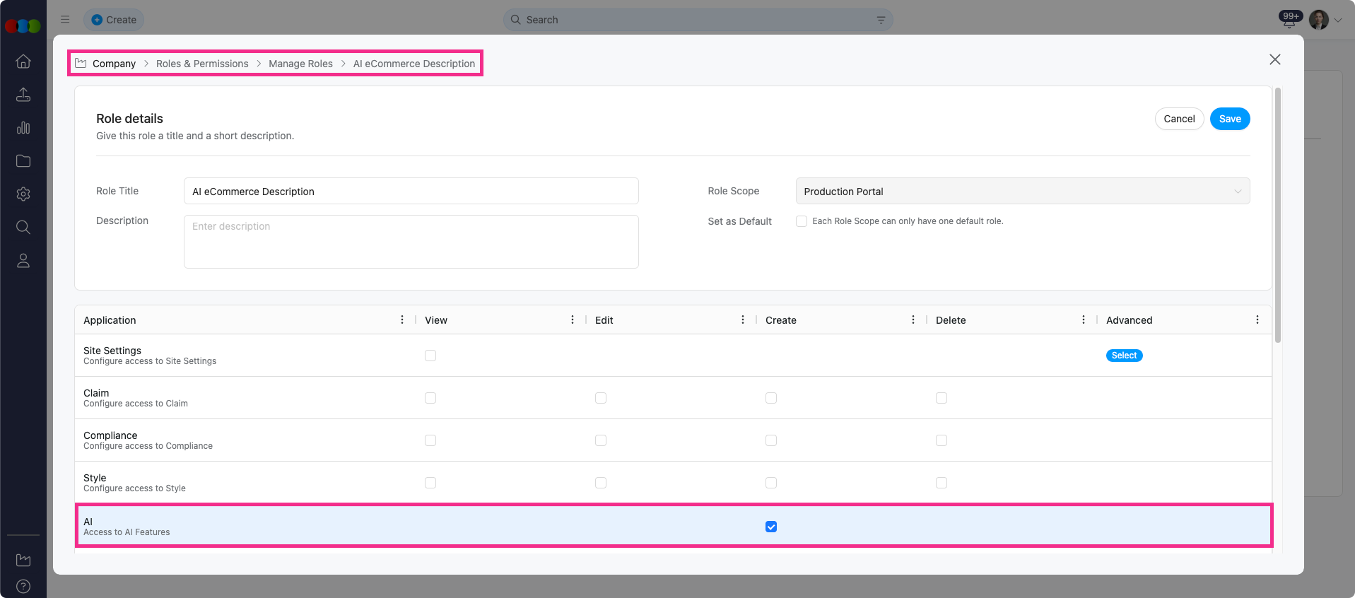 Then, ensure the “Create” permission is enabled under Site Settings > Company > Roles & Permissions > AI.