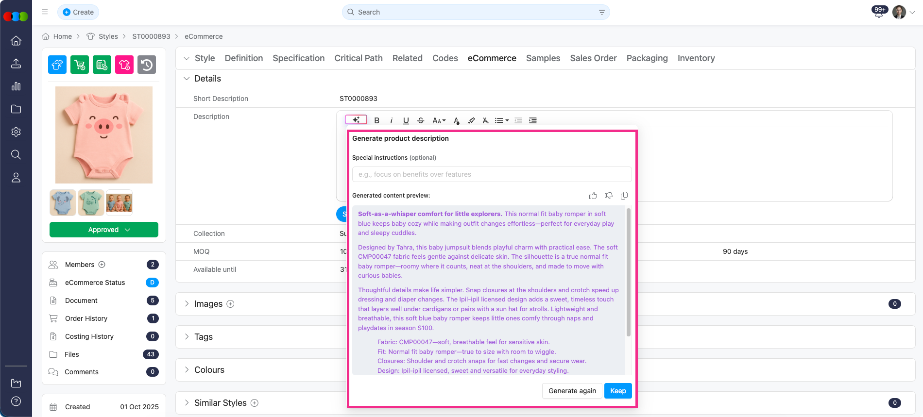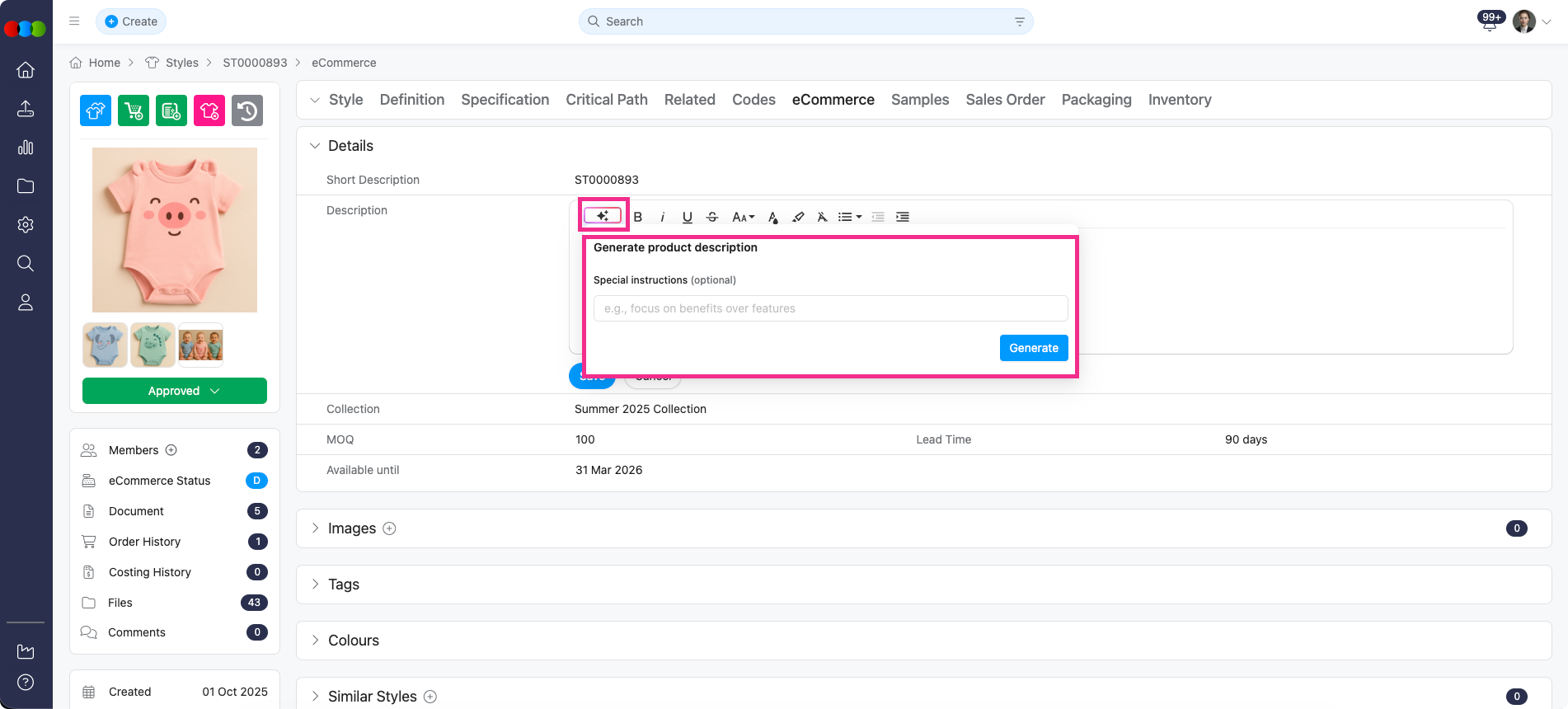 To generate an AI eCommerce description for a single style, navigate to Style > eCommerce > Description, click inside the Description box, and tap the Beautify icon at the top-left corner. You may add special instructions or proceed directly to generate.