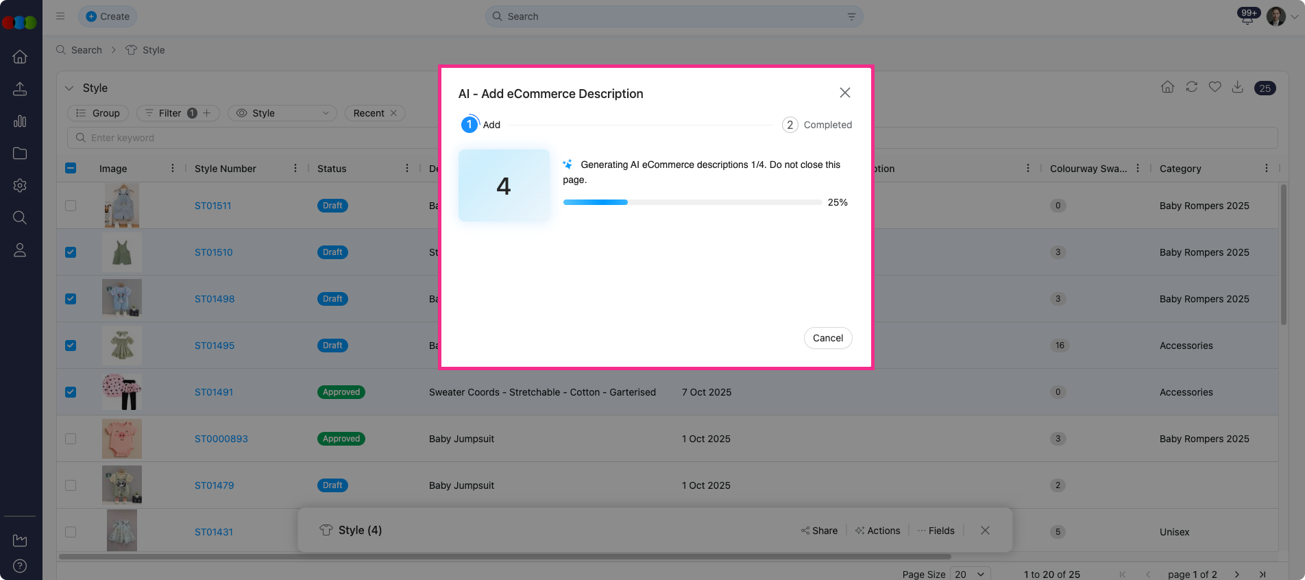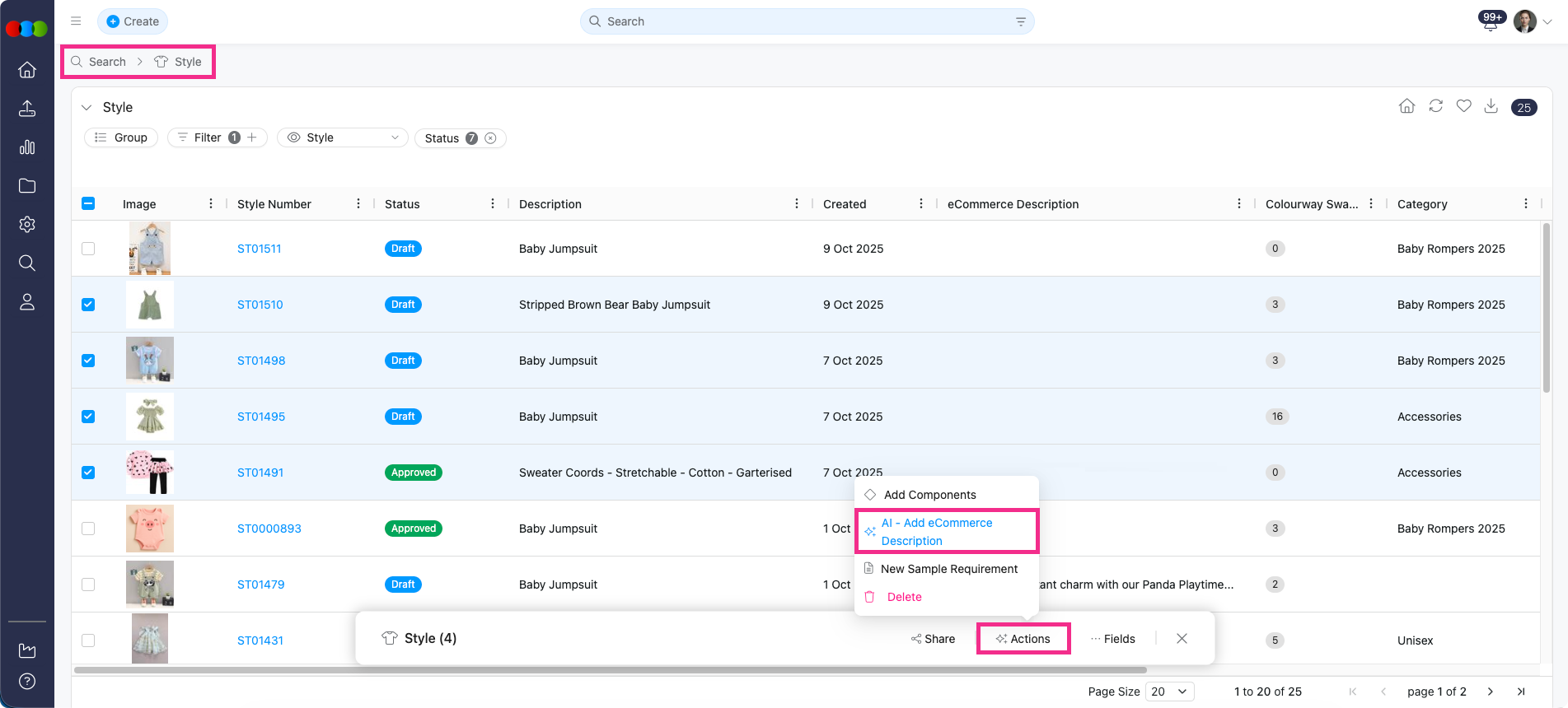 To generate in bulk, go to Style Search > Bulk Actions, select the styles, click Actions, and choose "AI - Add eCommerce Description". In the confirmation pop-up, click Yes to proceed or No to cancel.