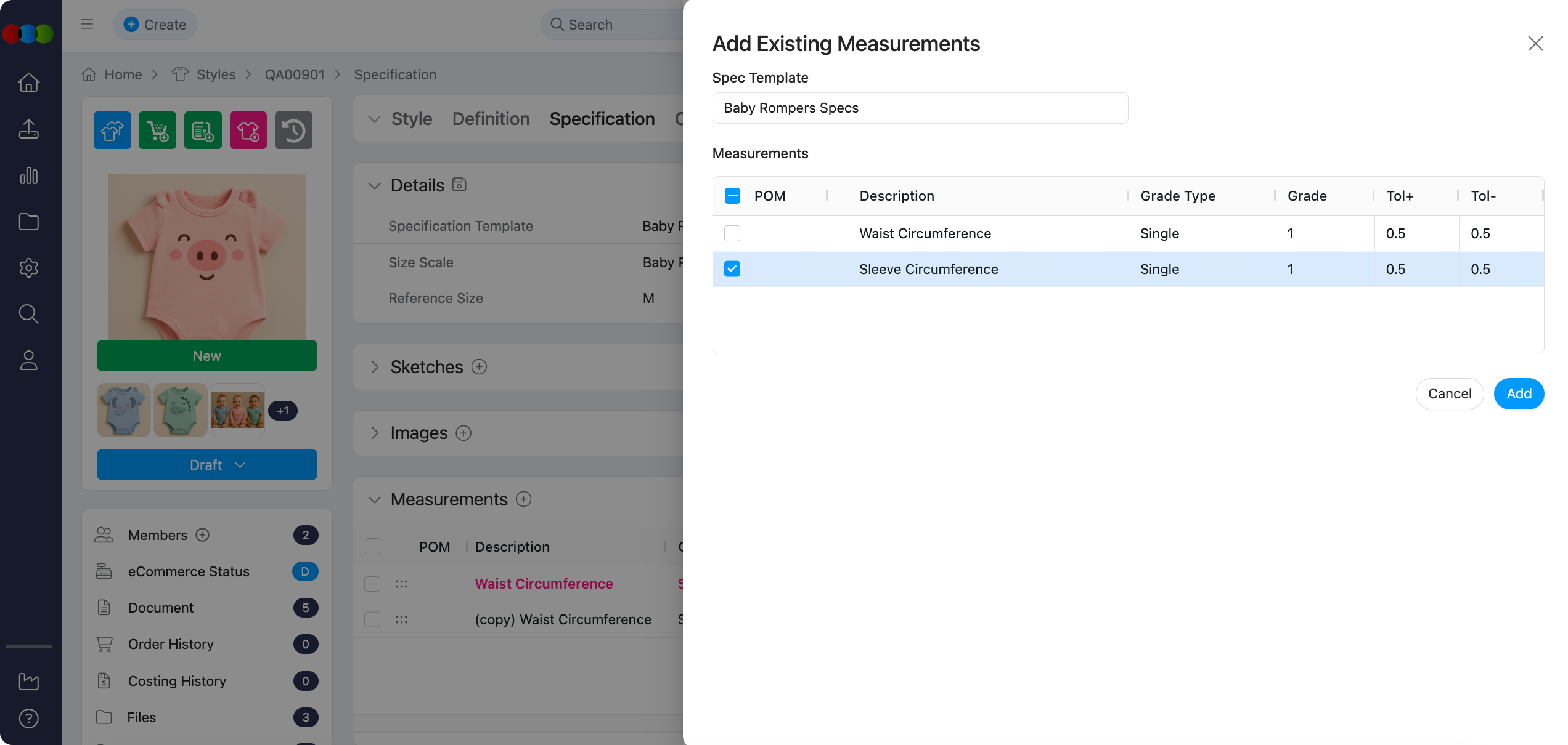 Style > Specification > Measurements > Add Existing Measurement Pop-up