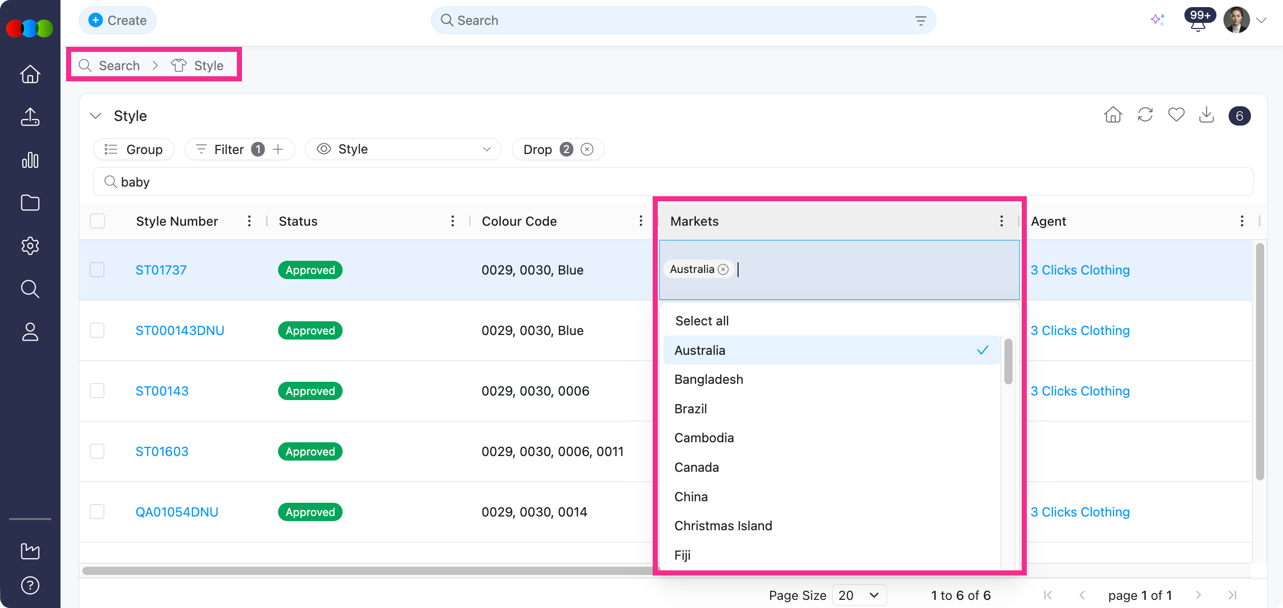 We've enhanced the Search > Style view by making the Market field editable directly from the search results, streamlining your workflow when updating regional information for multiple styles.