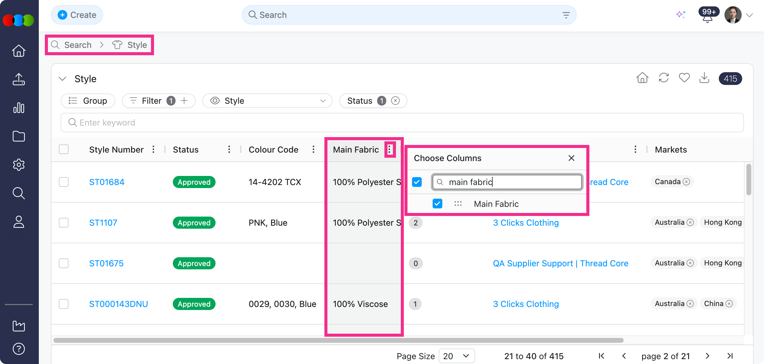We've added a new Main Fabric column to Search > Style, allowing you to view and report on the primary fabric for each style directly from your search results.