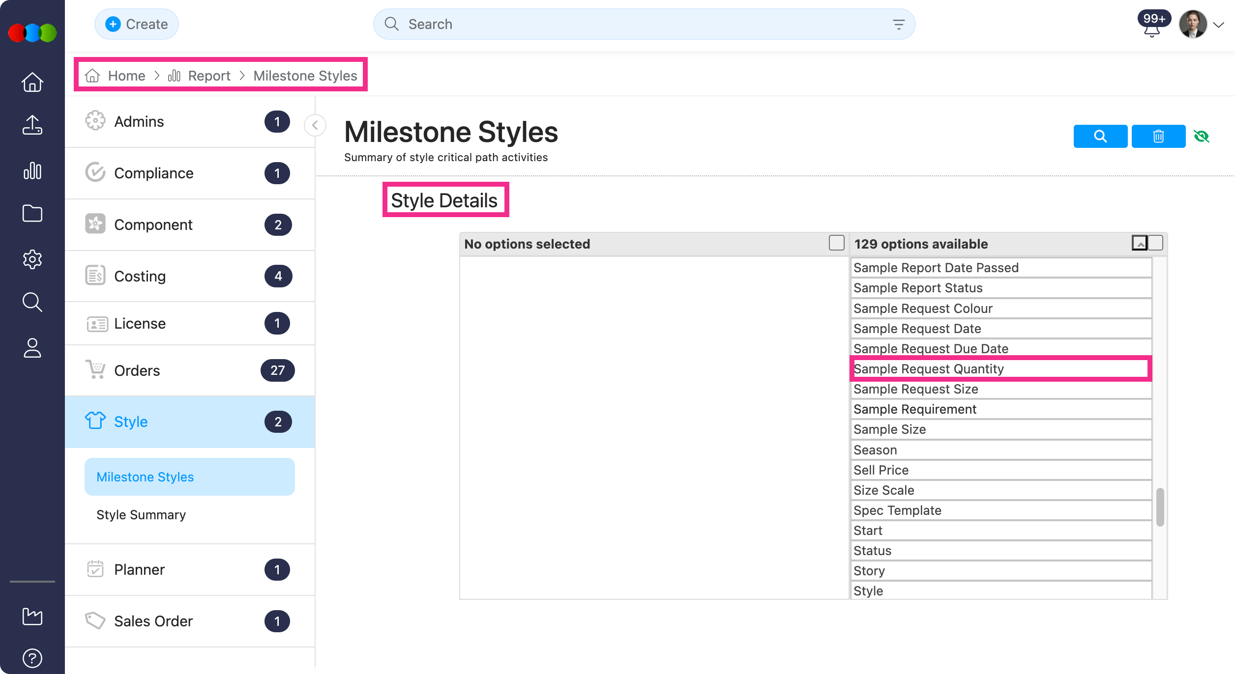 For the available columns and configuration options, refer to Reports > Orders > Milestone Orders and Reports > Style > Milestone Styles in the documentation portal.