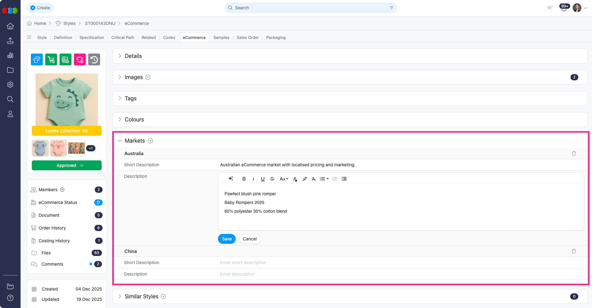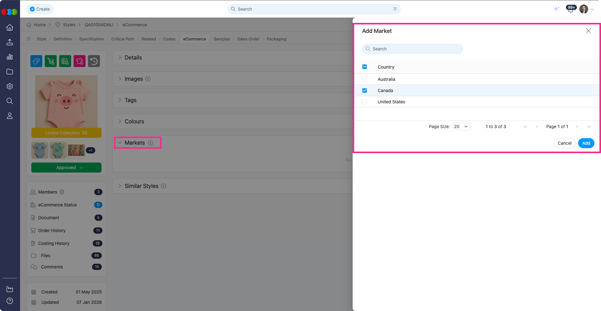 - Added a Markets section. The countries displayed in the Add Market pop-up are the ones that was selected in your Style > Details > Additional Markets.