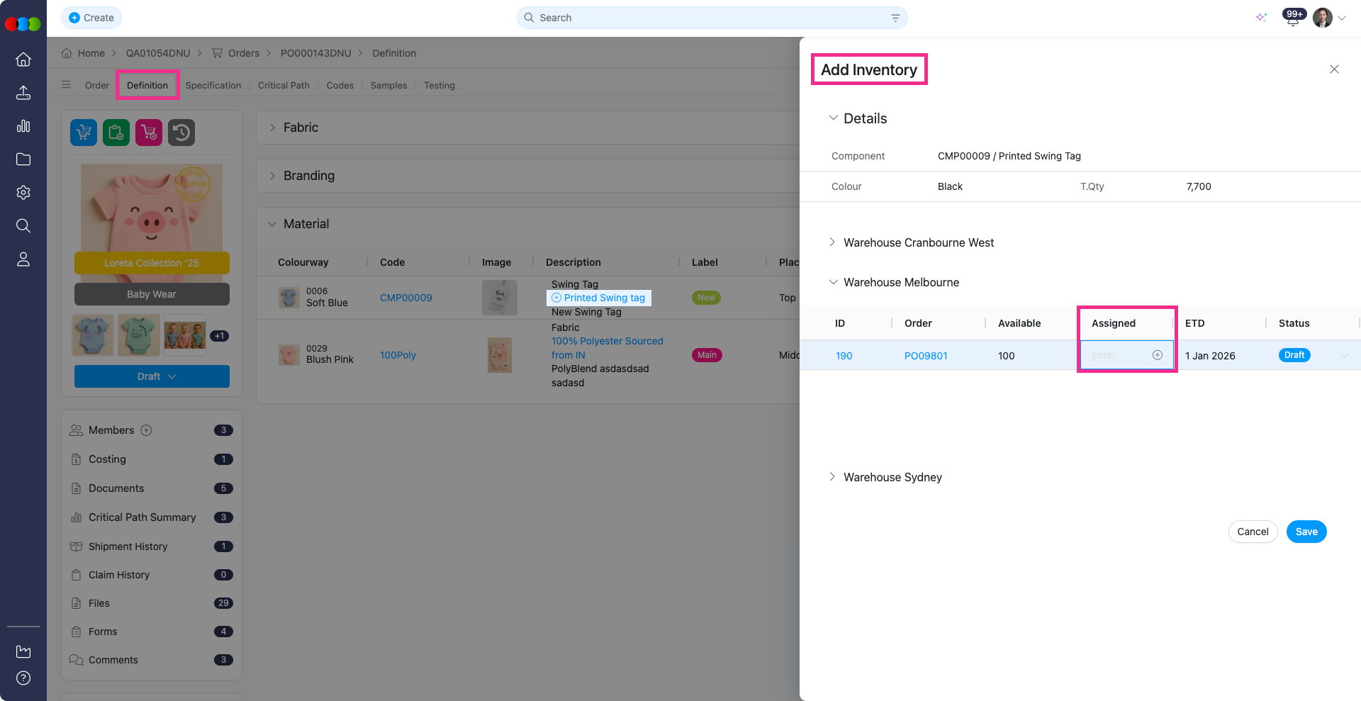 Order > Definition > Add Inventory