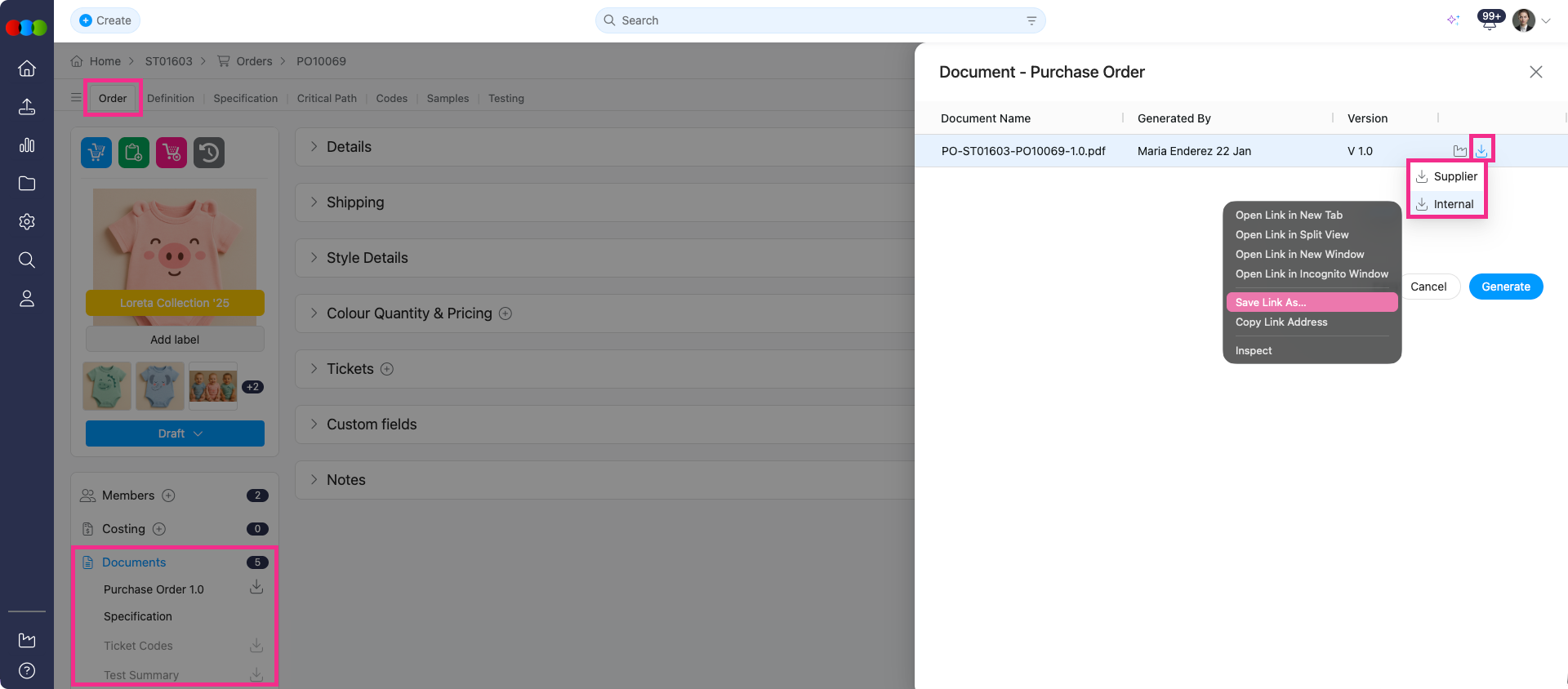 When you click the download icon, a dropdown menu allows you to download either Supplier or Internal copy of the document.