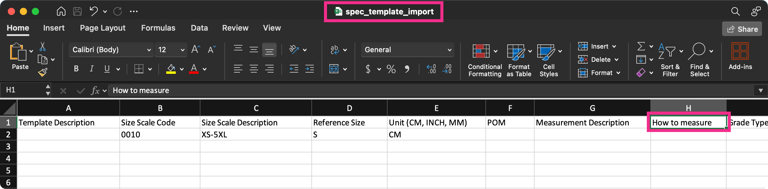 - The How to measure column has been added to the Specification Import template, enabling you to bulk import measurement instructions alongside your other specification data.