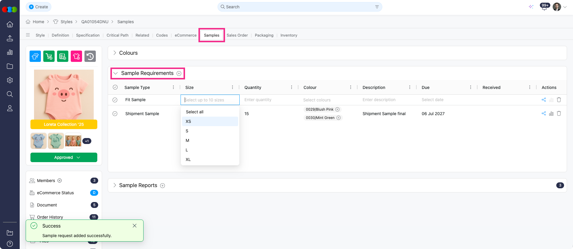 We’ve enhanced the Sample Requirements section in both the Style and Order applications to make adding sample requests quicker and easier.