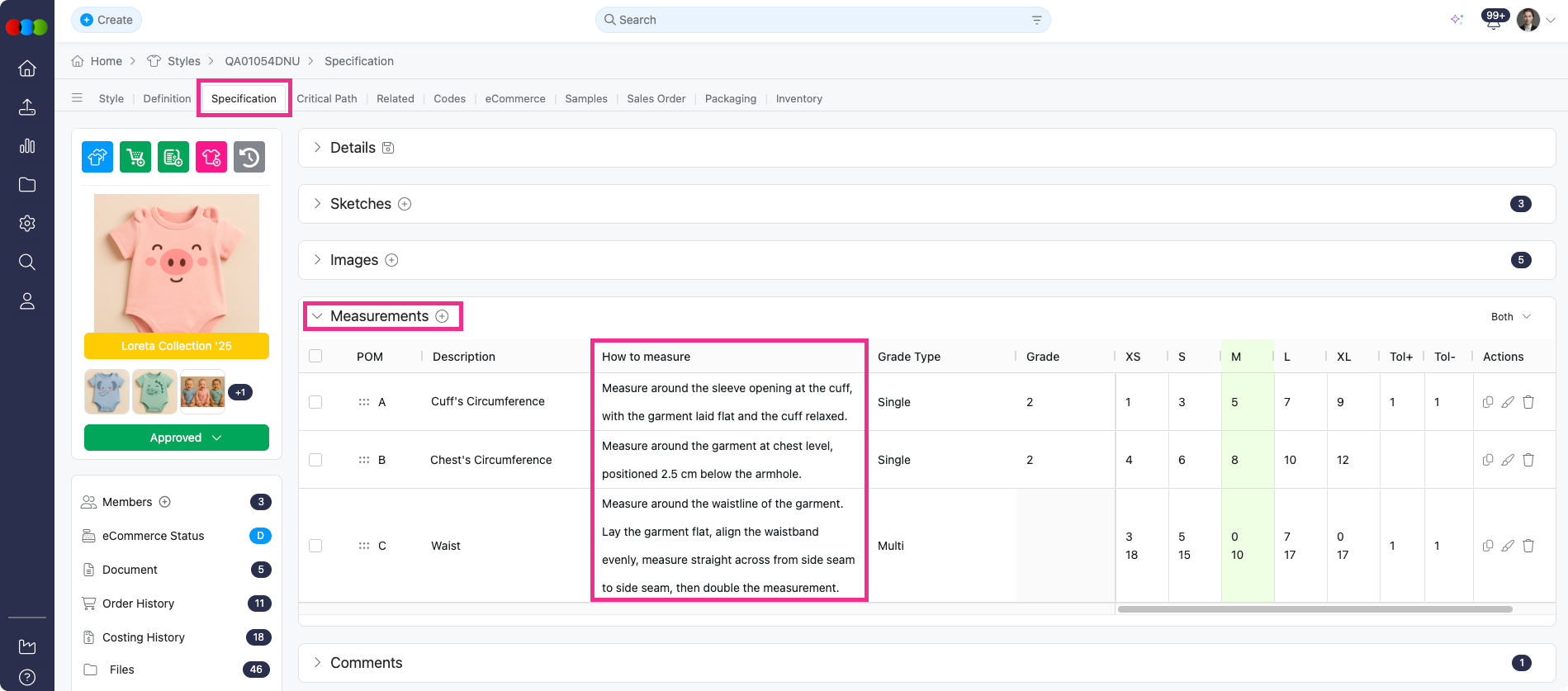 We've added a new optional column to enhance your Style > Specification measurement instructions. The How to Measure is an optional column that allows you to provide detailed measurement instructions for each Point of Measurement (POM), helping your team and suppliers understand exactly how measurements should be taken.