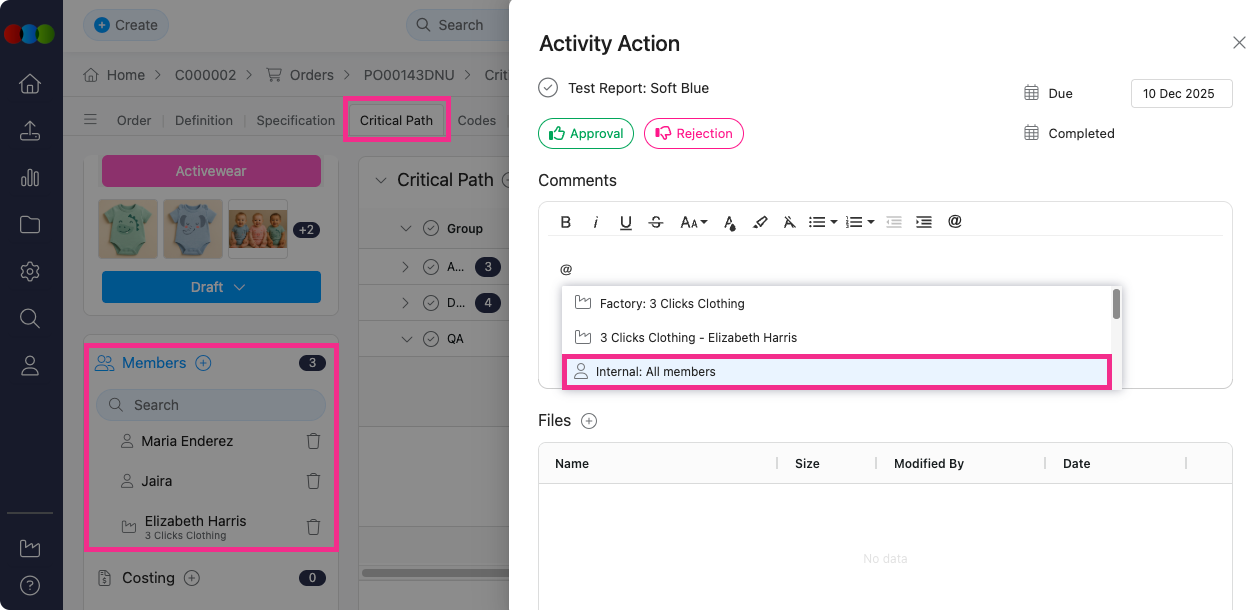 We've improved the @mention feature in activity comments within Style/Order > Critical Path, making it easier to notify all team members at once.