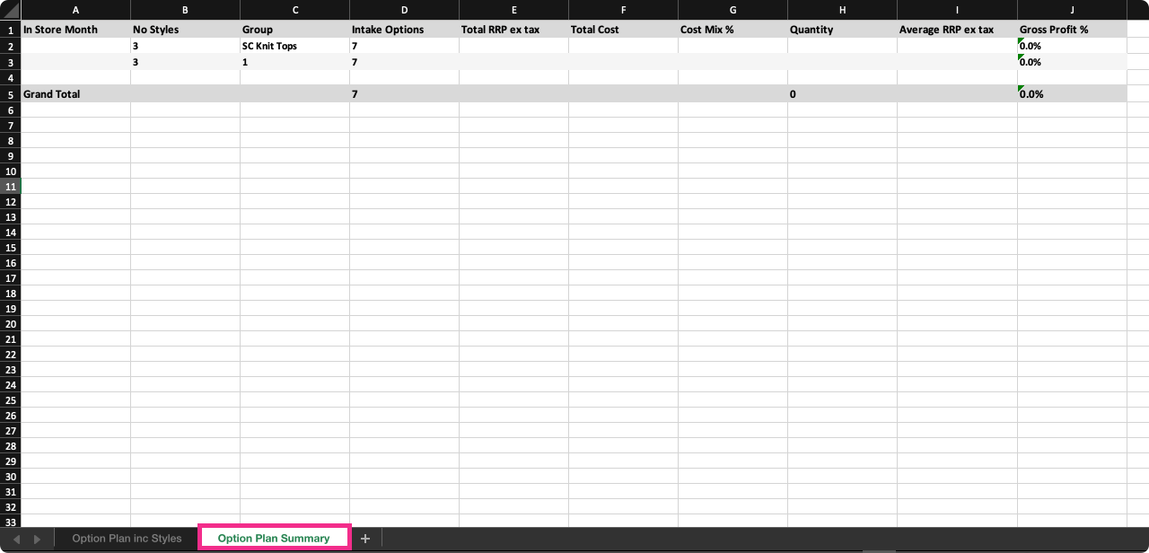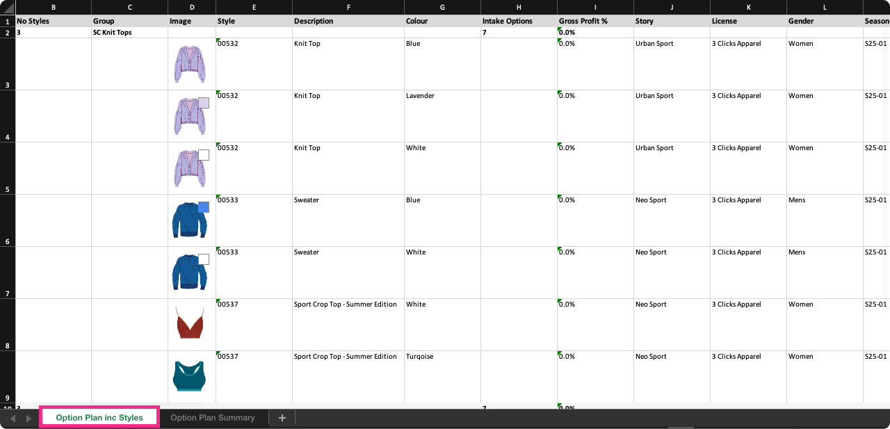 - Tab 1 – Option Plan inc Styles – A detailed view displaying styles by colour, grouped by In Store Date and Group in the same order as your Planner. Includes: