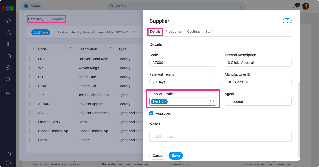 Edit Supplier > Details > Supplier Profile