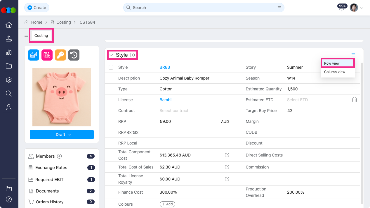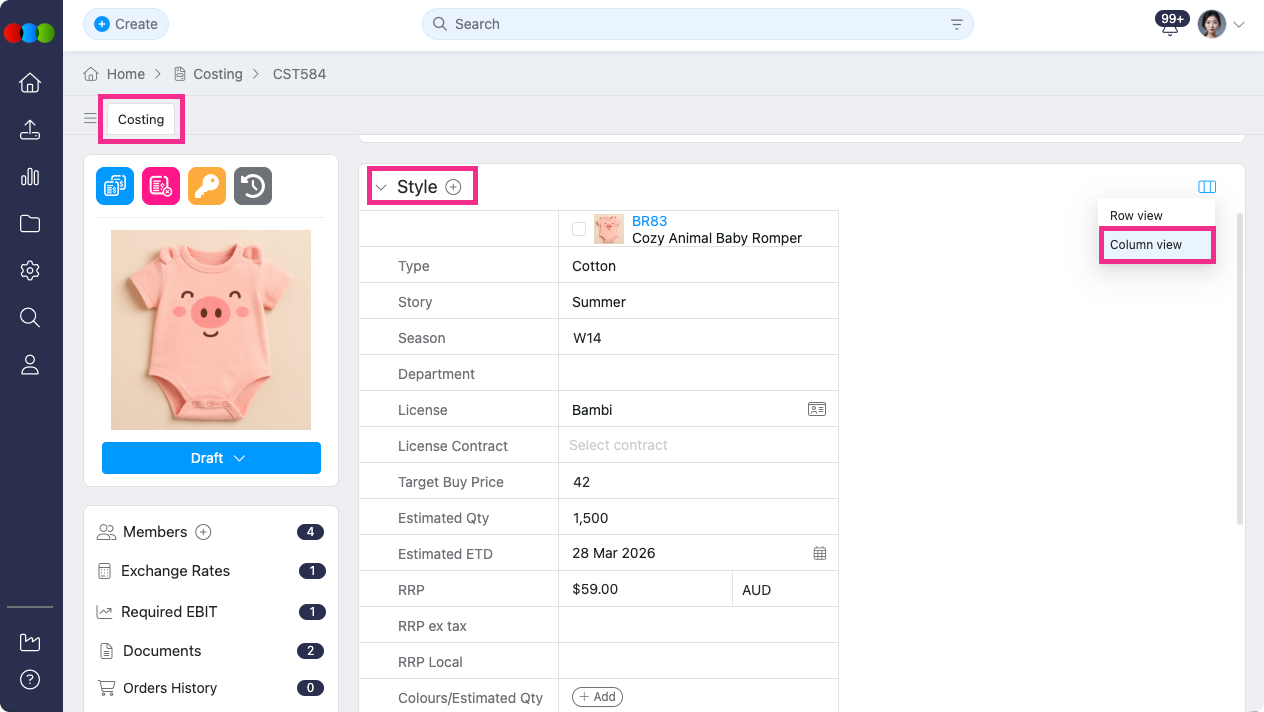 Costing > Retail & Import Type > Style > View Options (Column/Row)