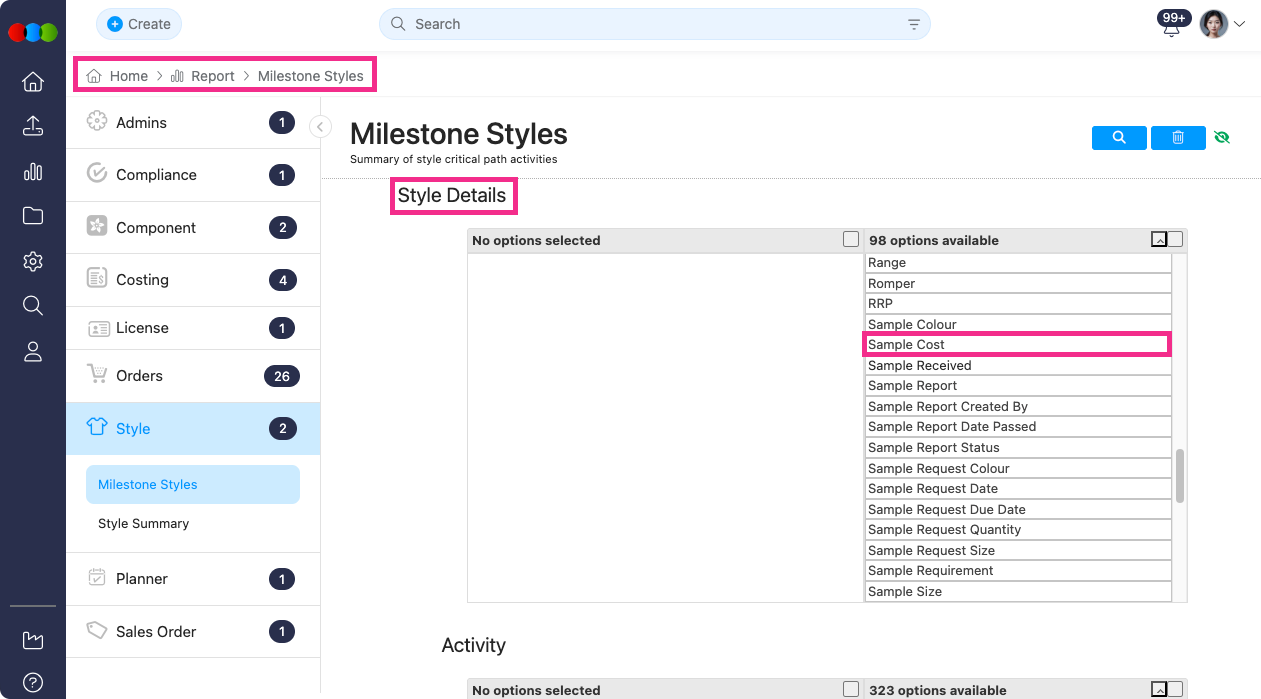 For Milestone Styles report configuration, refer to Reports › Style › Milestone Styles in the documentation portal.
