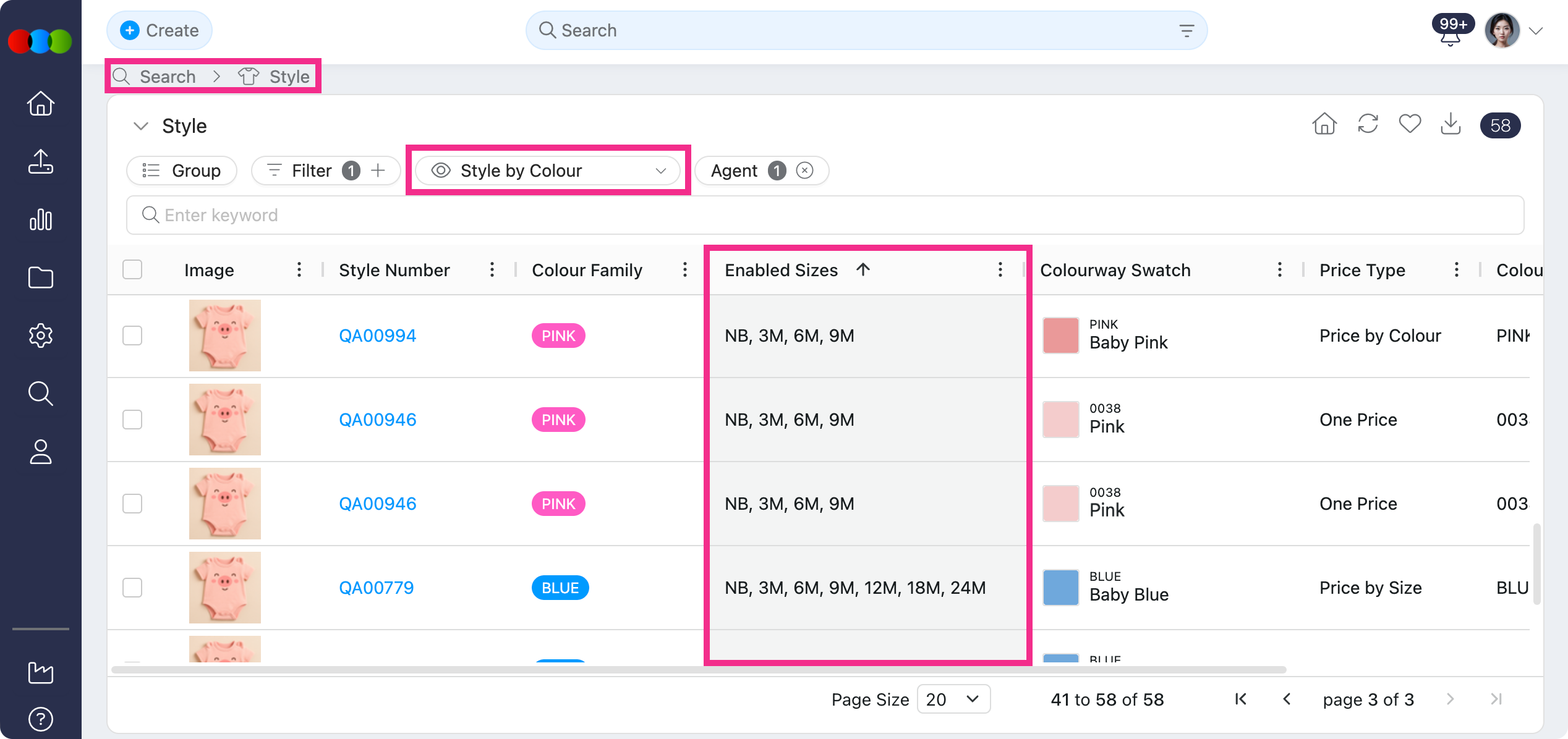 We've added the Enabled Sizes column as a new option when using the Style Search > Style by Colour view.