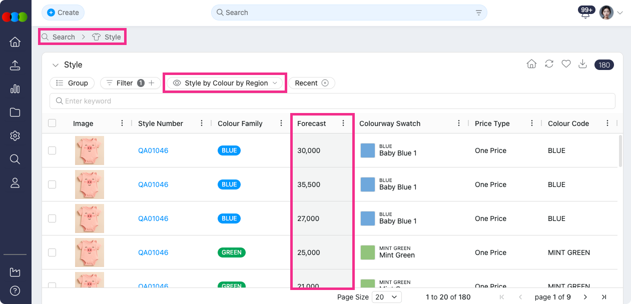 We've added a new Style Search view that allows you to view the styles by colour with its designated regional forecasts and projection data. Forecasts displayed here are directly pulled from Style > Colours & Pricing > Market view.