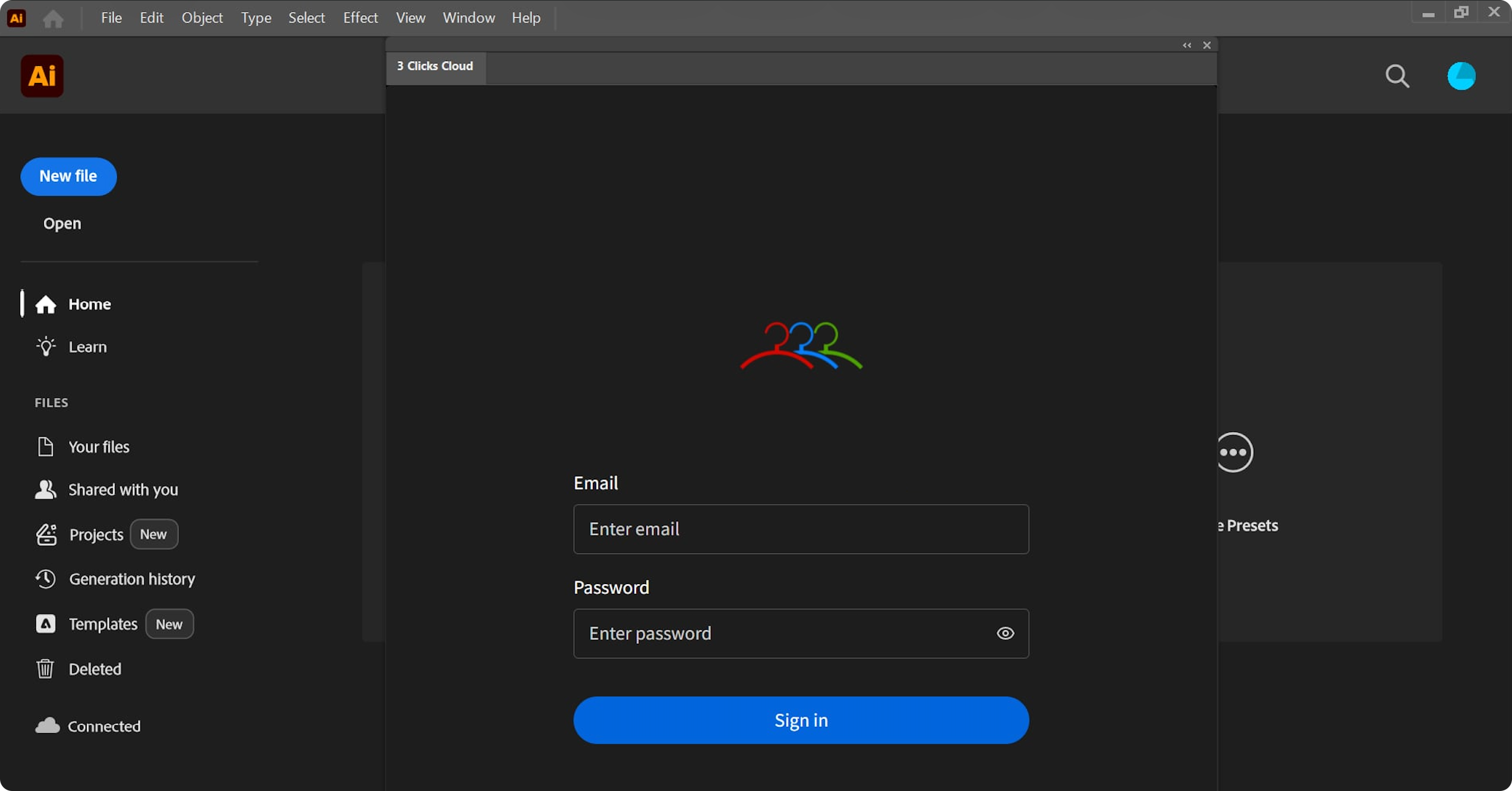 - Navigate to Window > Extensions > 3 Clicks Cloud (refer to Step 5 in the installation guide)