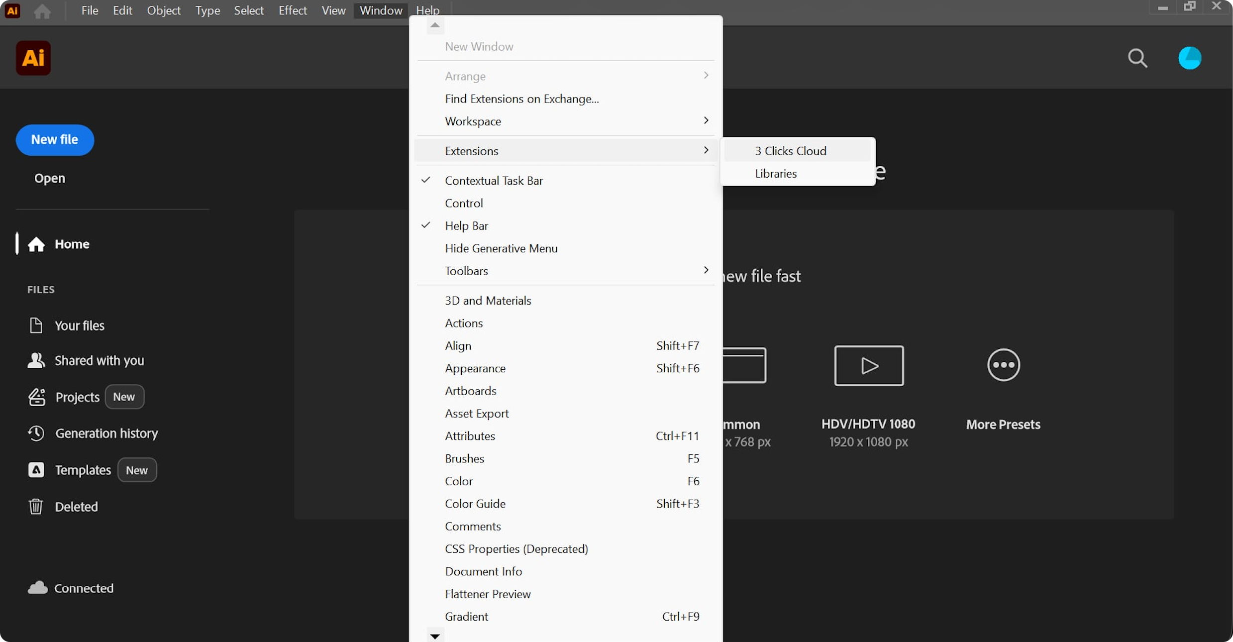| 5. Open Extension | Navigate to Window > Extensions > 3 Clicks Cloud ![]() |