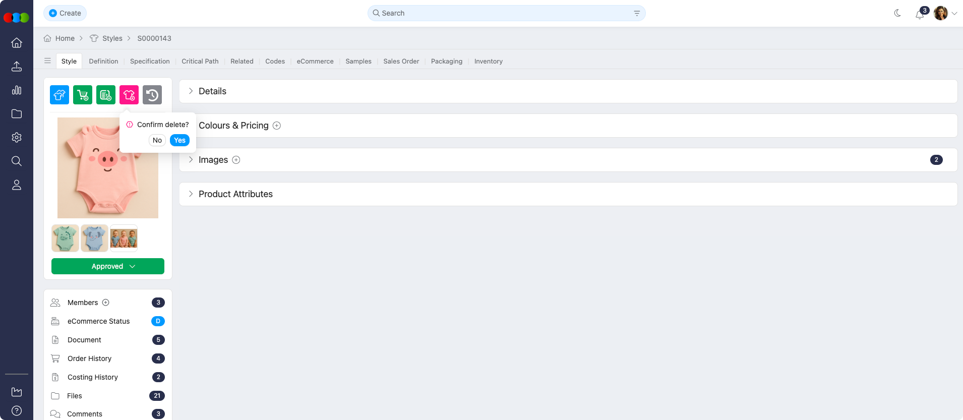 The Delete function in the Style module allows authorised users to permanently remove a style record. This action is irreversible and should only be performed when a style is no longer needed or was created in error. It removes the style from the system entirely, so it should be reserved for obsolete ranges, mistaken entries, or catalogue clean-up once dependencies have been checked.